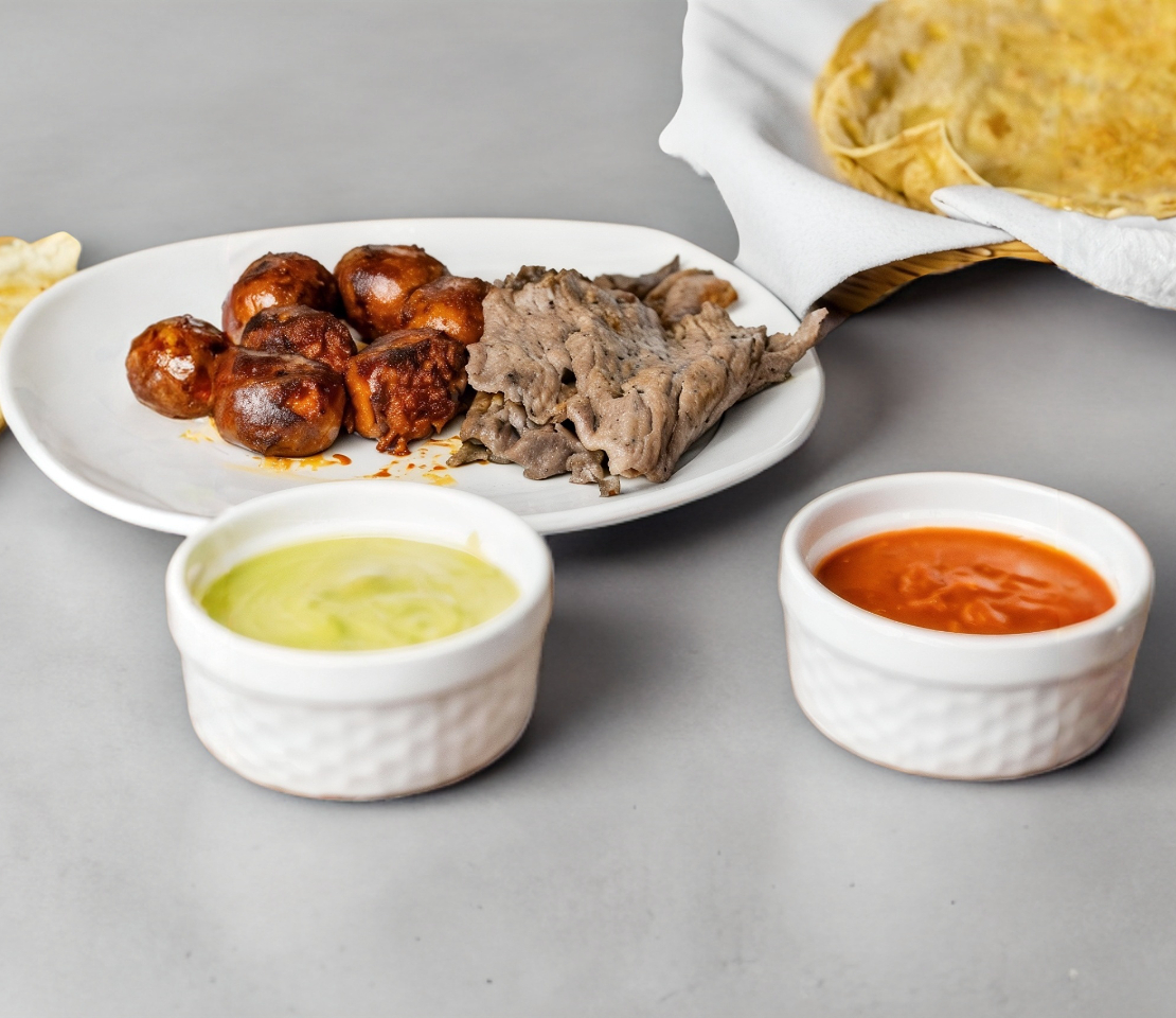200 gramos de tasajo y 200 gramos de chorizo de cerdo acompañado de guacamole, salsa roja, pasta de frijol y tortillas hechas a mano (El producto se pesa en crudo)