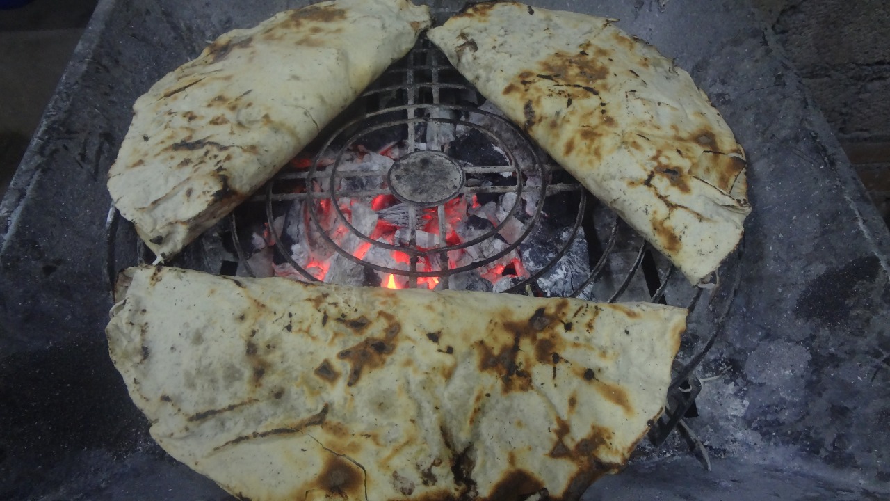 Tortilla de harina casera con quesillo gratinado y tasajo encebollado, cilantro, guacamole, guacachile, salsa roja, limón.