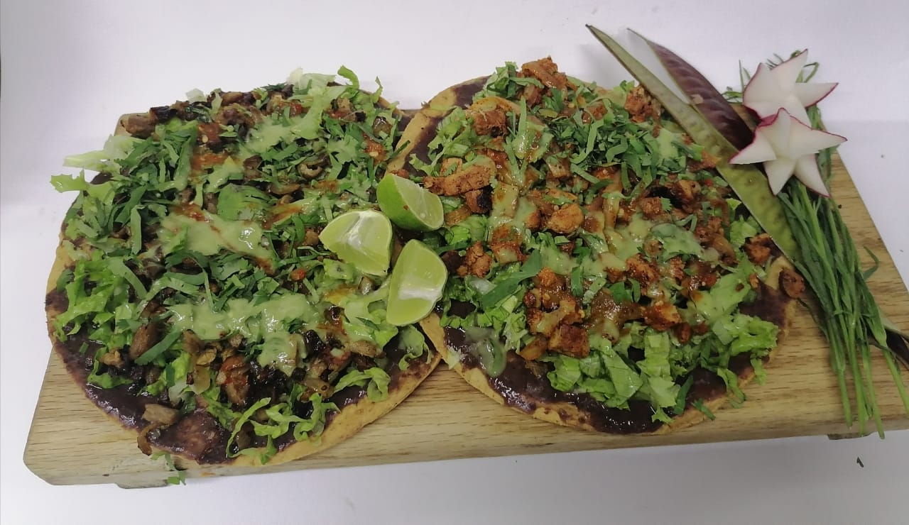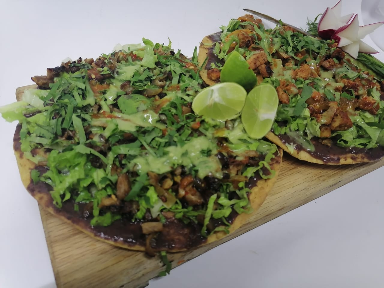 Tostada frita con base de pasta de frijol o guacamole, verdura a elegir, acompañada de complementos.