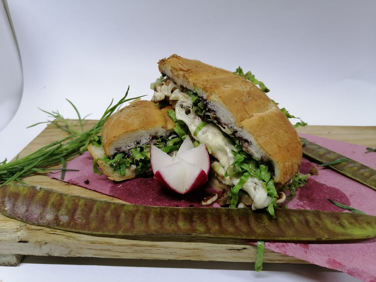 Pan telera con pasta de frijol, mayonesa, col o lechuga y quesillo gratinado.