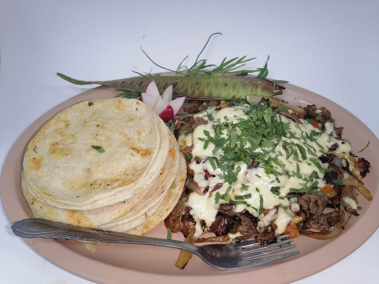 Pimiento morrón, cebolla, jamón, tasajo, quesillo gratinado, cilantro y tortilla taquera 20 pzas, acompañado de complementos.