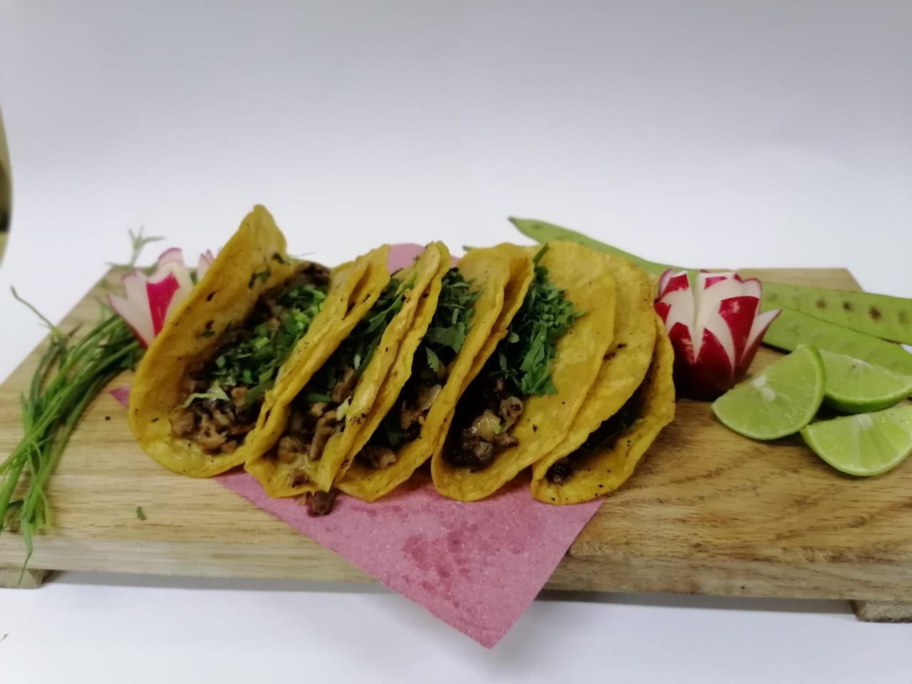 Deliciosos tacos de tasajo con costilla encebollados, cilantro, acompañados de complementos tradicionales.