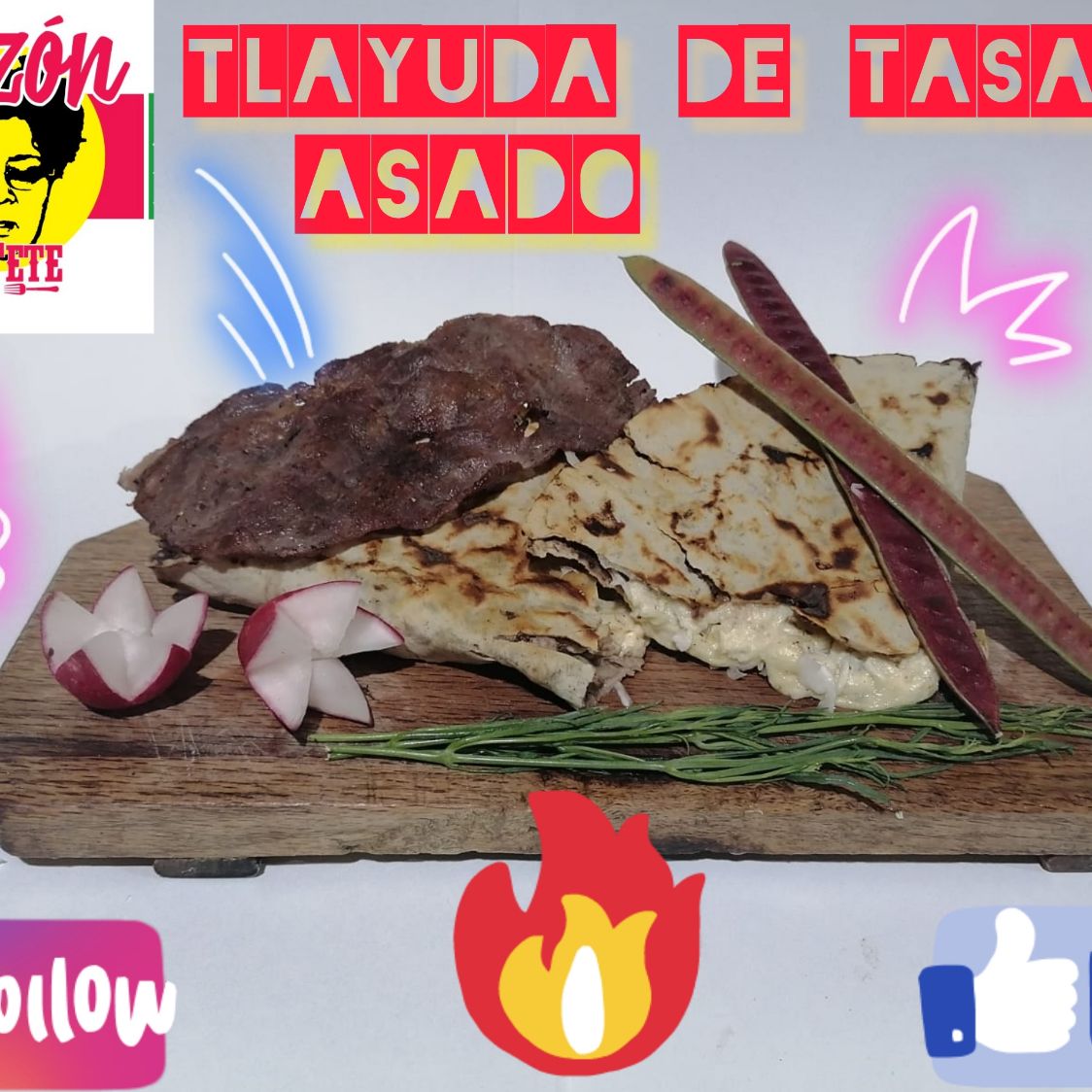 Deliciosa tlayuda doradita, col o lechuga, quesillo, aciento, pasta de frijol, 110 gramos de tasajo asado más complementos.