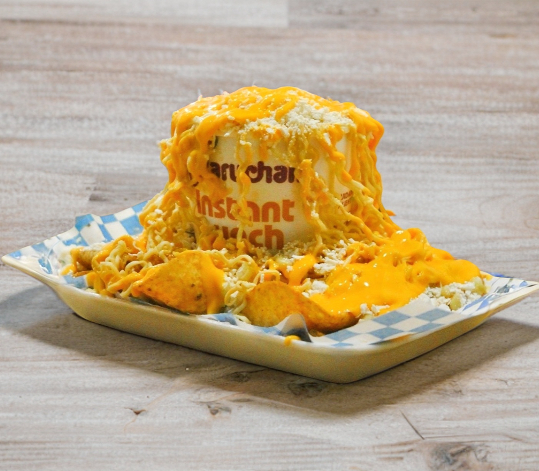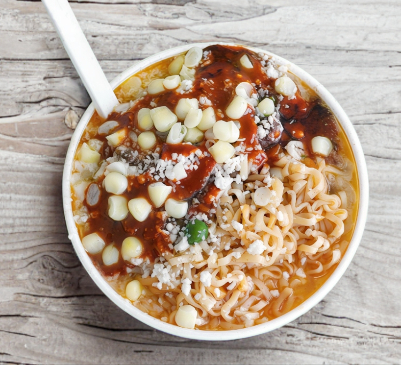 Maruchan preparada con esquite, mayonesa, quesillo y chapulines.