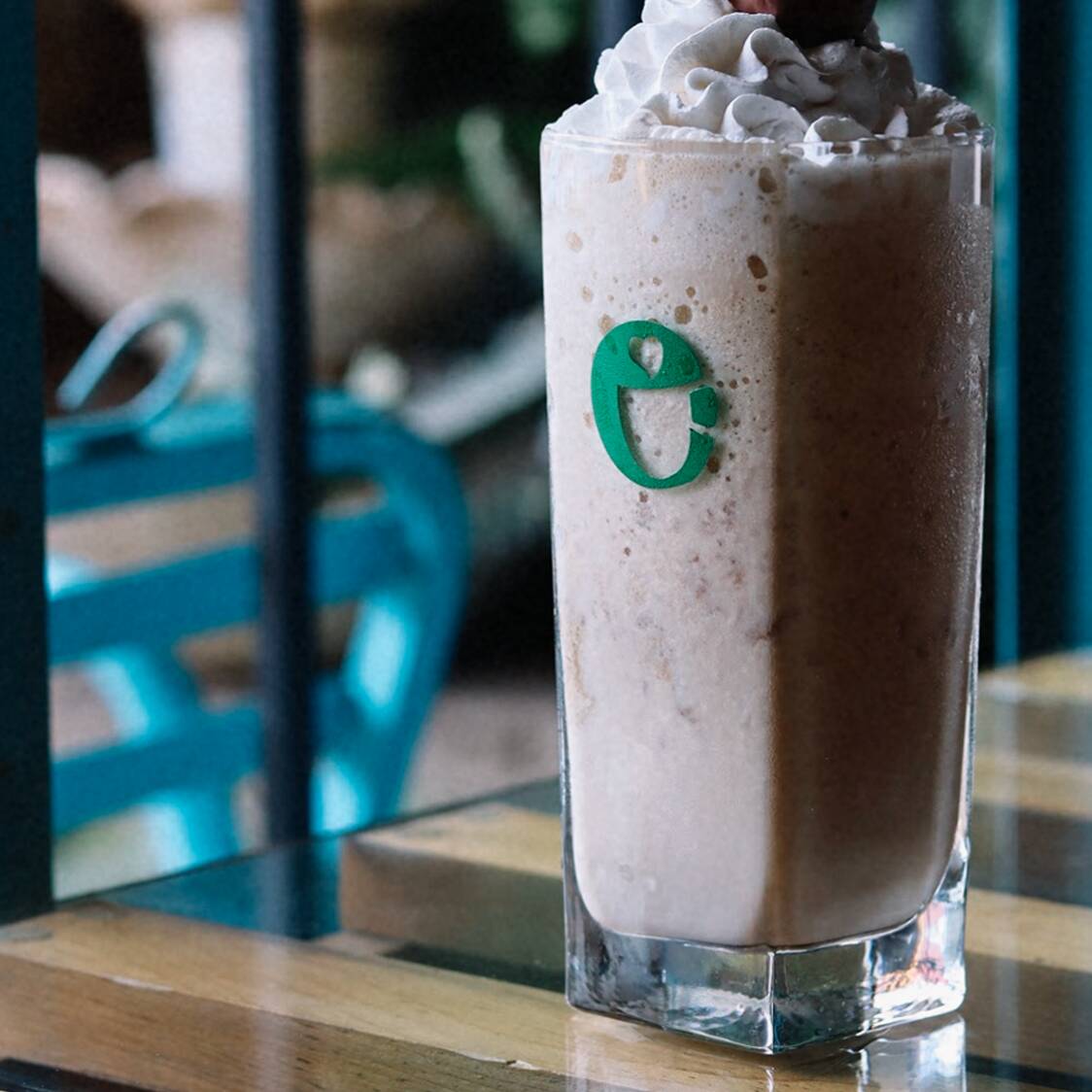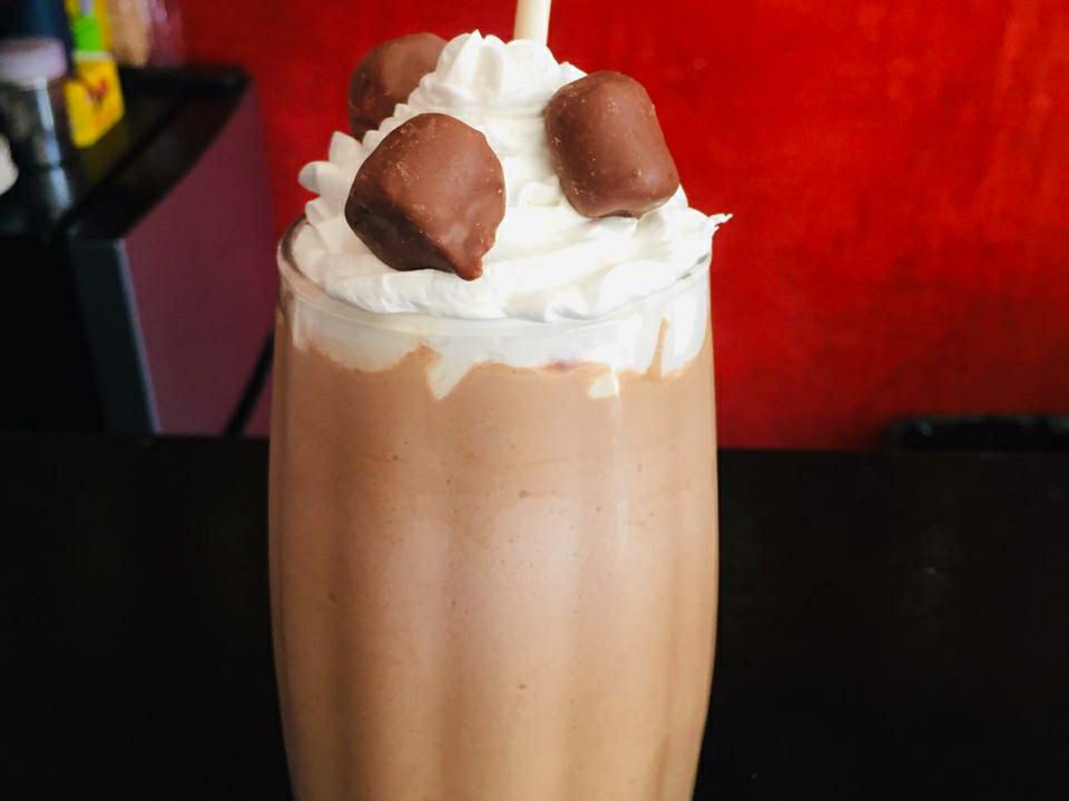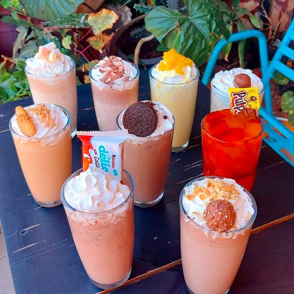 Delicioso té chai preparado con leche y una carga de café, molido con hielos y decorado con crema batida y bombones de colores.