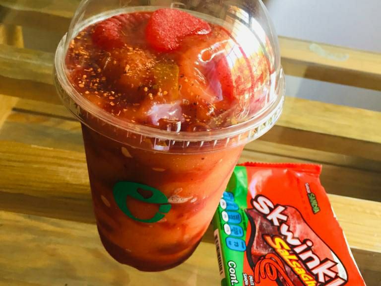 Preparada con mango y chamoy, coronada con gomas de manguitos y chamoy.