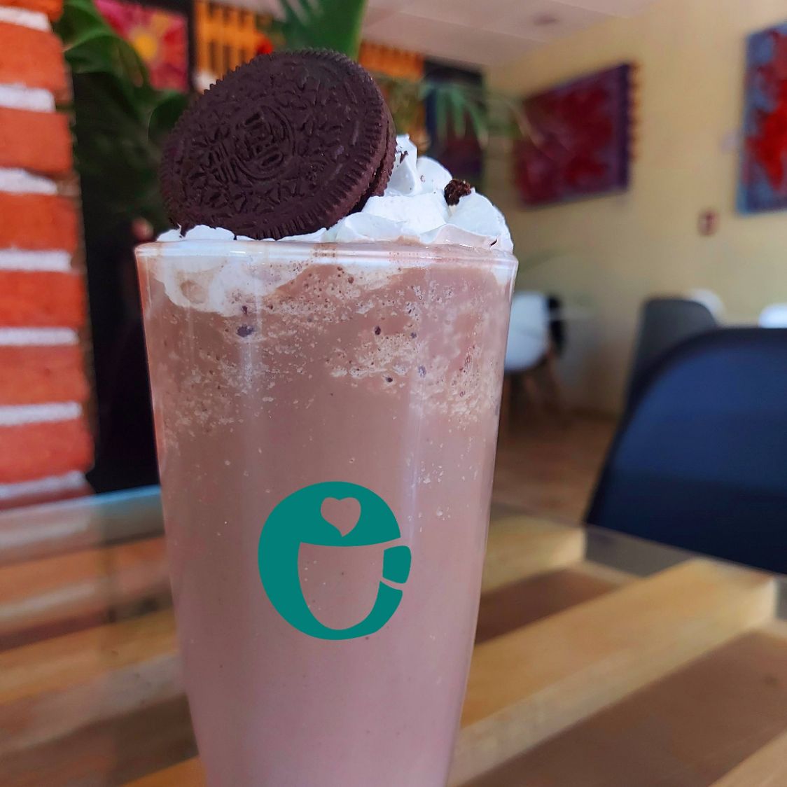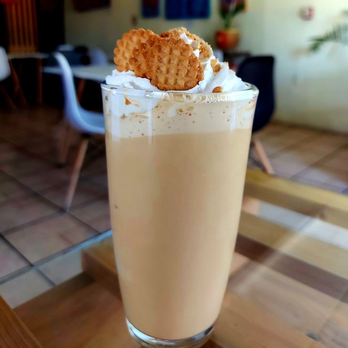 Riquísimo té chai preparado con leche y molido con hielos, decorado con crema batida y bombones de colores.