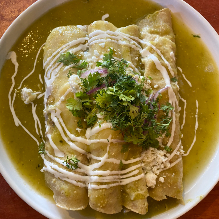 Orden de cuatro tortillas pochadas, rellenas de pollo, bañadas en salsa verde y gratinadas con queso mozzarella, queso fresco, crema, queso, cebollita, y brotes de cilantro criollo.