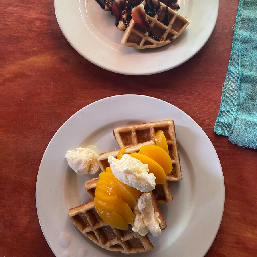 Ricos waffles con durazno en almíbar, lechera y nutella