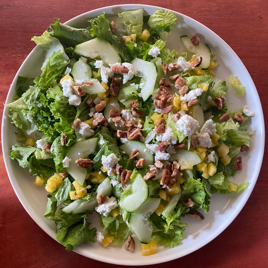 Lechuga, pepino, nuez, manzana, piña, queso de cabra; con aderezo miel-mostaza