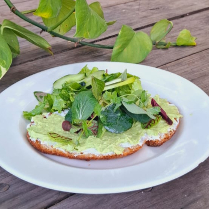 Dos rebanadas de pan de masa madre dorado en mantequilla, untado con queso de cabra, aguacate martajado con un toque de limón y un toque de aceite de chiles. Acompañado de ensalada. Proteína a elegir.