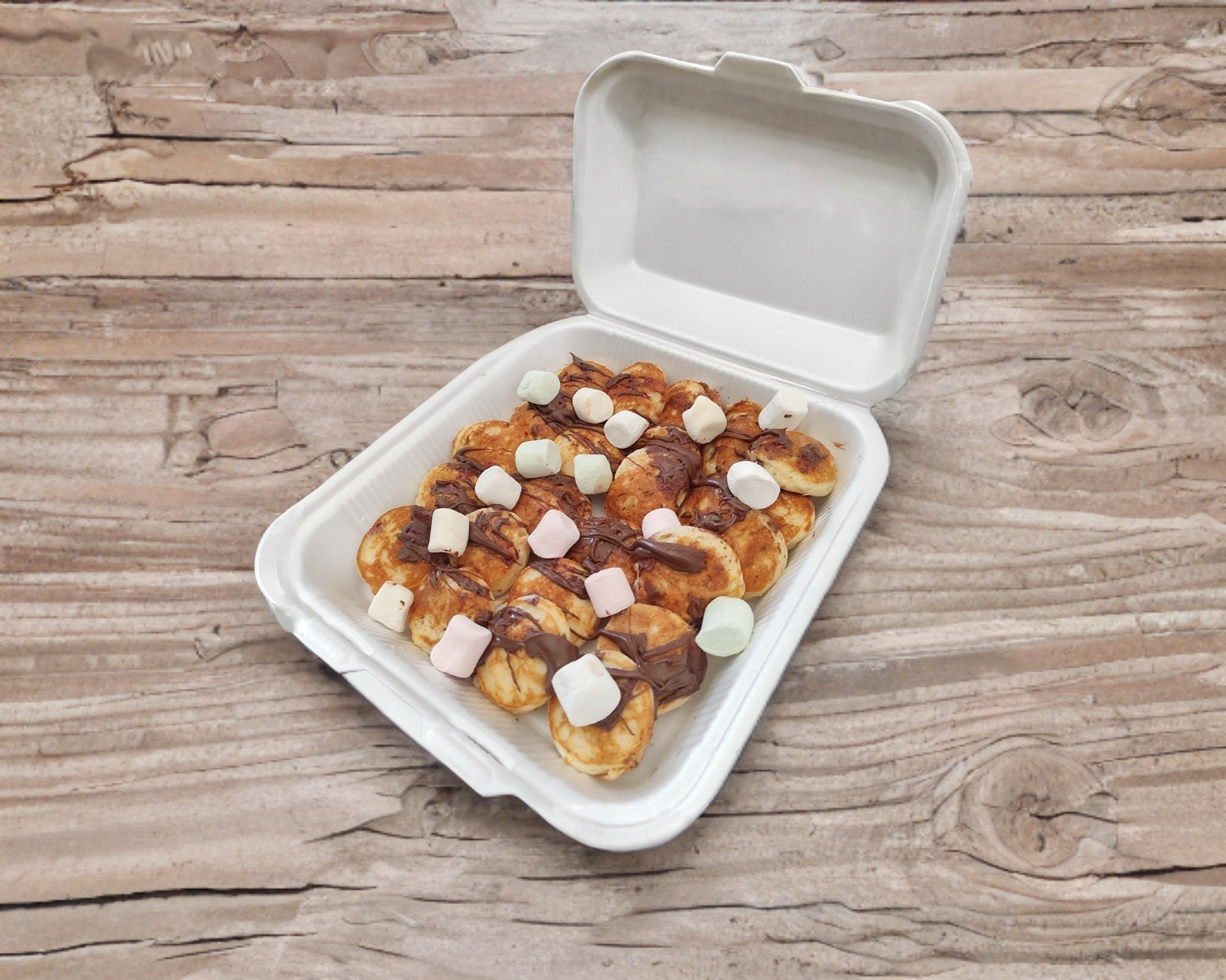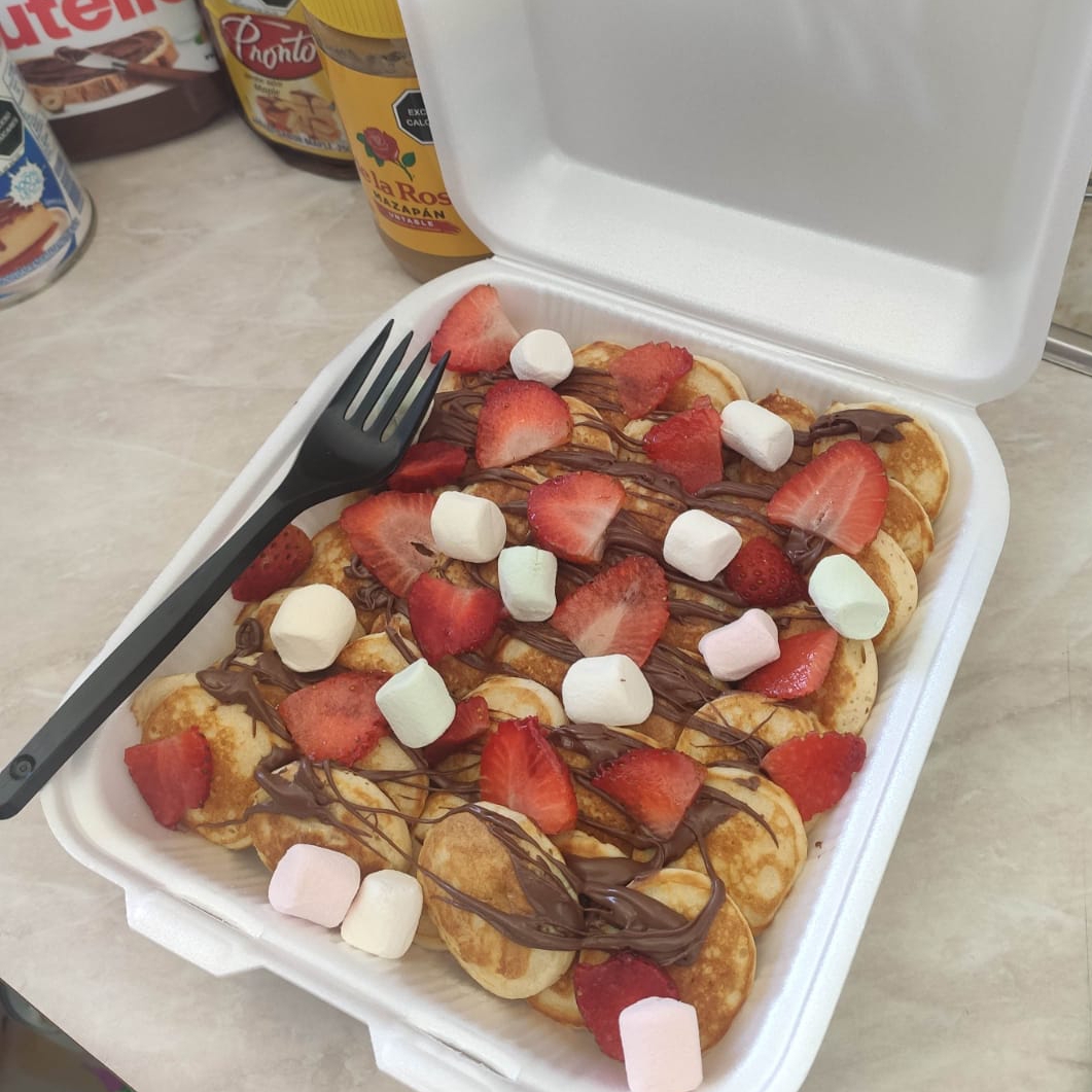 24 Piezas de Mini Hot cakes, con 1 Jarabe y 1 Topping a elegir.