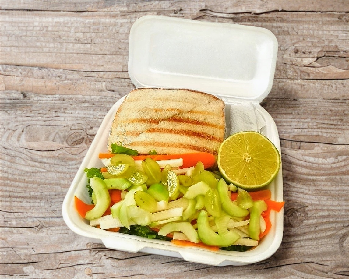 Tres rebanadas de pan blanco, acompañado de 90 gr de atún, lechuga, tomate, aguacate, mayonesa. Acompañado de ensalada (zanahoria, pepino y jícama)