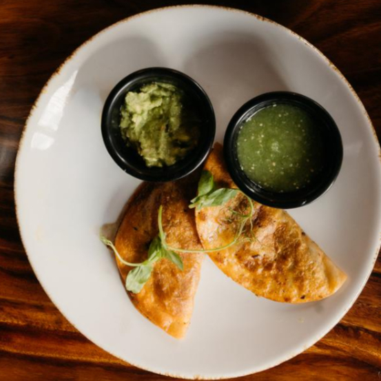Dos quesadillas de aguja de res ahogadas en consomé gratiandas con quesillo, con aguacate y salsa verde