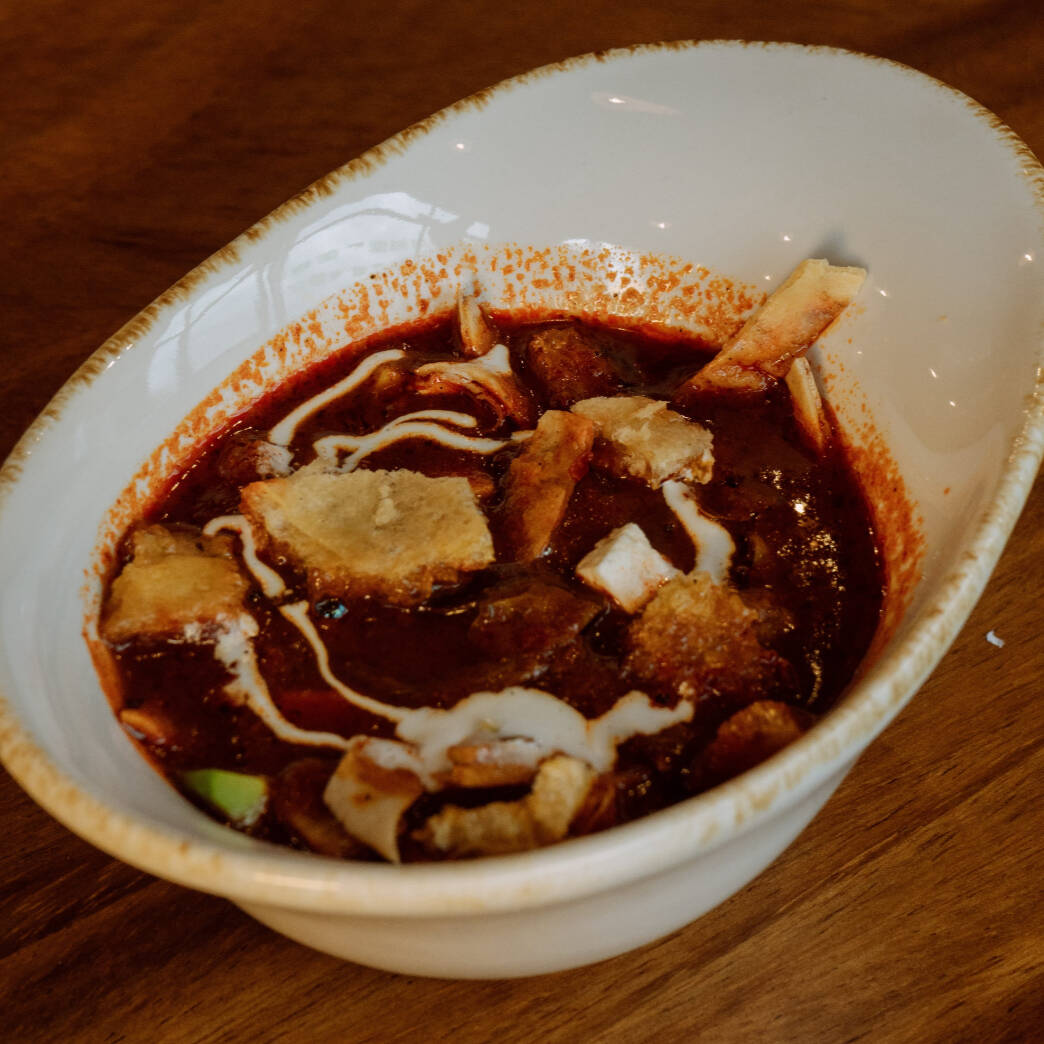 Tortilla frita en sopa de tomate asado, aguacate, chicharrón, queso fresco y crema ácida