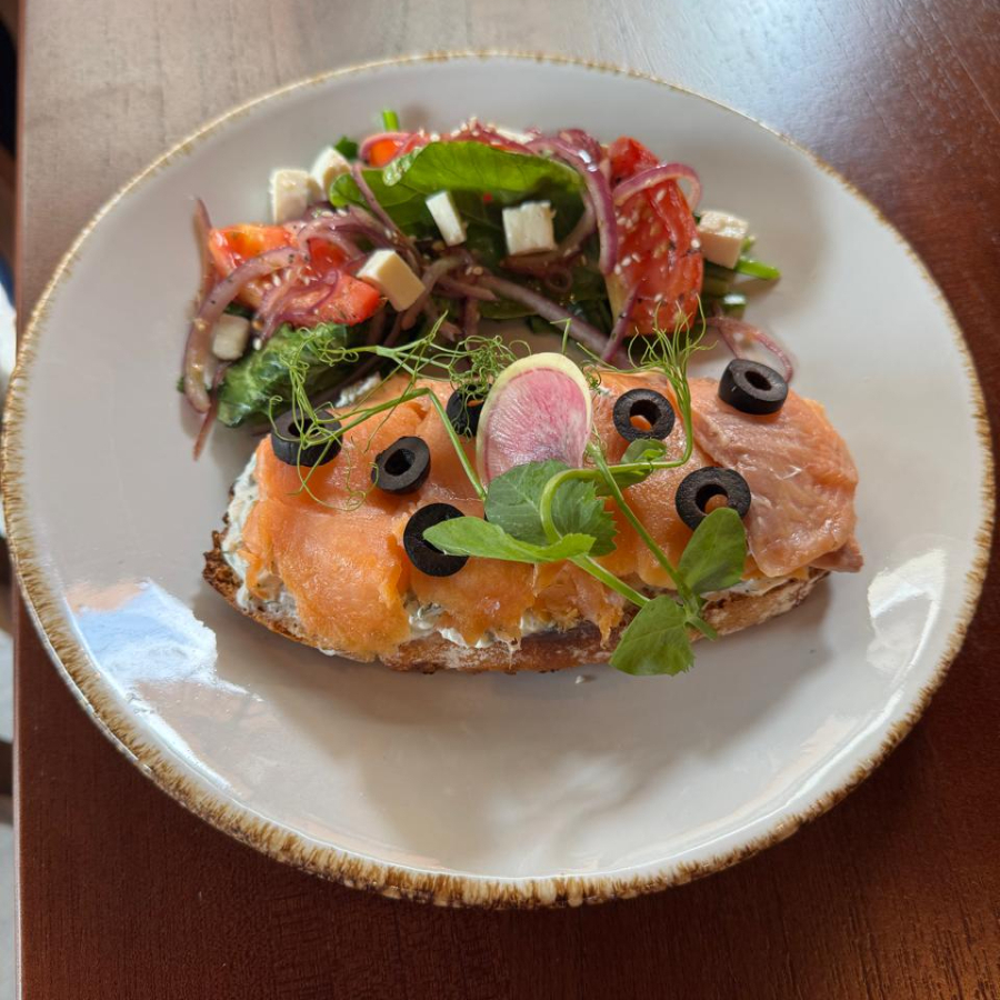 Pan crocante con cama de queso crema y salmón ahumado encima, acompañado con ensalada.