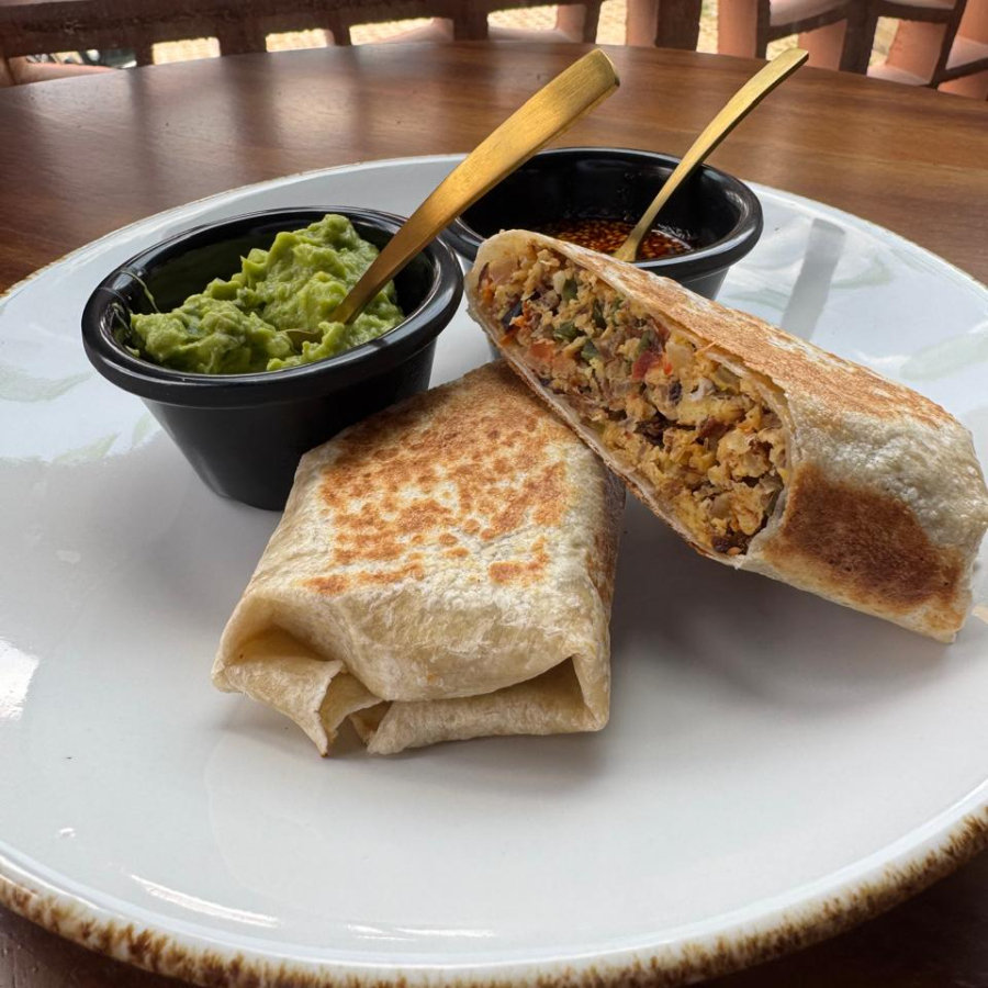 Machaca a la mexicana con huevo, acompañado de aguacate y salsa macha