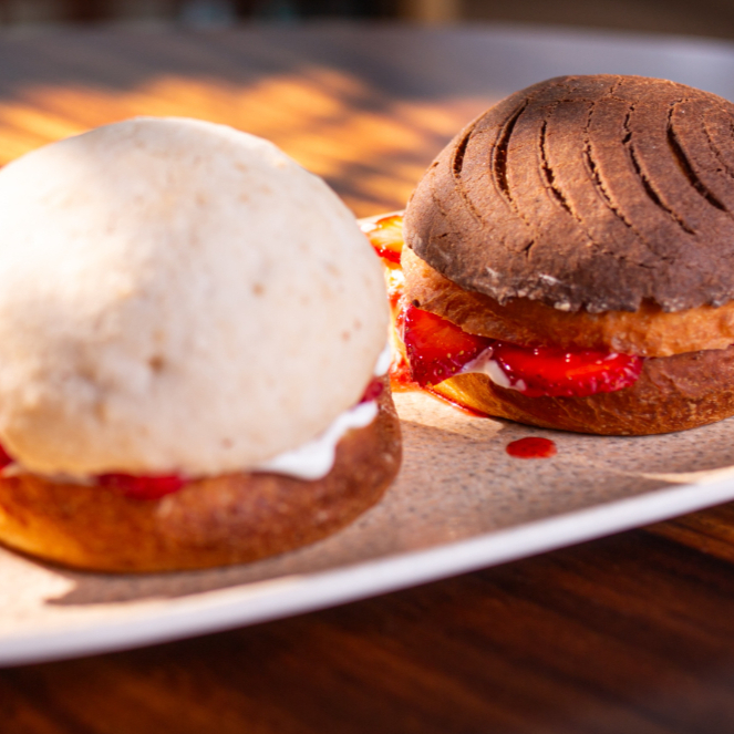 Conchas de la casa rellena con nata de leche fresca y mermelada de frutos rojos