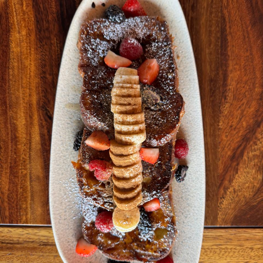 Pan de la casa remojado en leche con lavanda, caramelizado a la plancha; con frutos rojos, plátano y miel de maple
