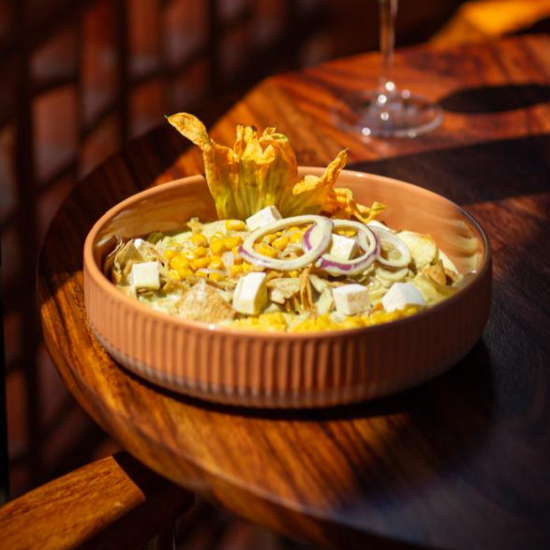 Relleno de quesillo y flor de calabaza; acompañado con ensalada de la casa