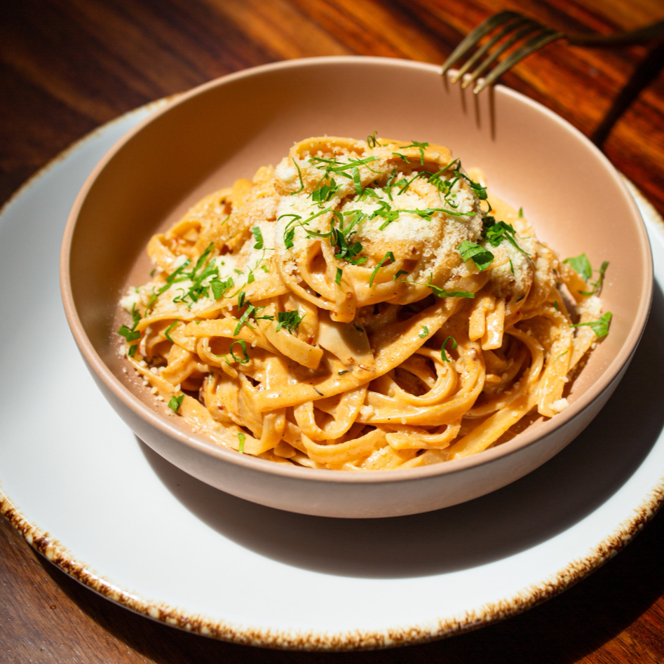 Pasta Fettuccini con salsa de crema con chipotle, tocino, jamón ahumado, perejil fresco y queso parmesano