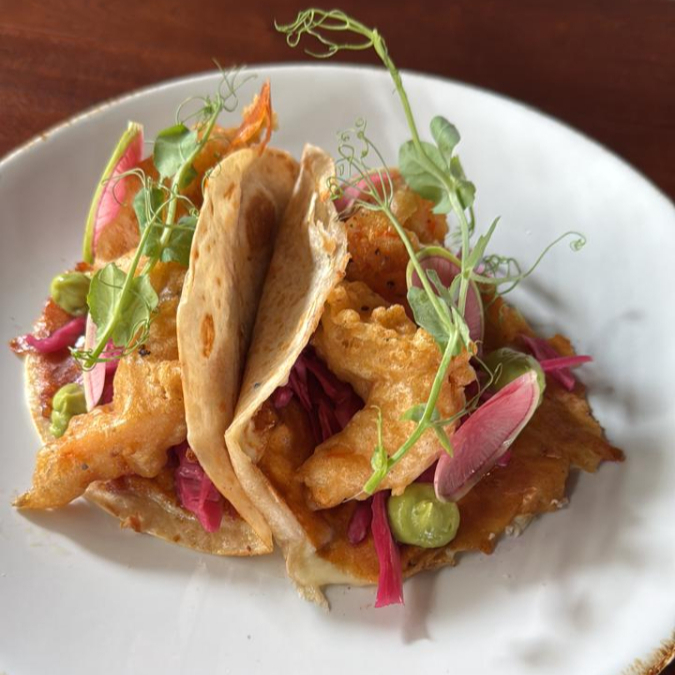 Tortilla de harina, camarones tempura, encurtido de col morada, aderezo de chipotle y guacamole
