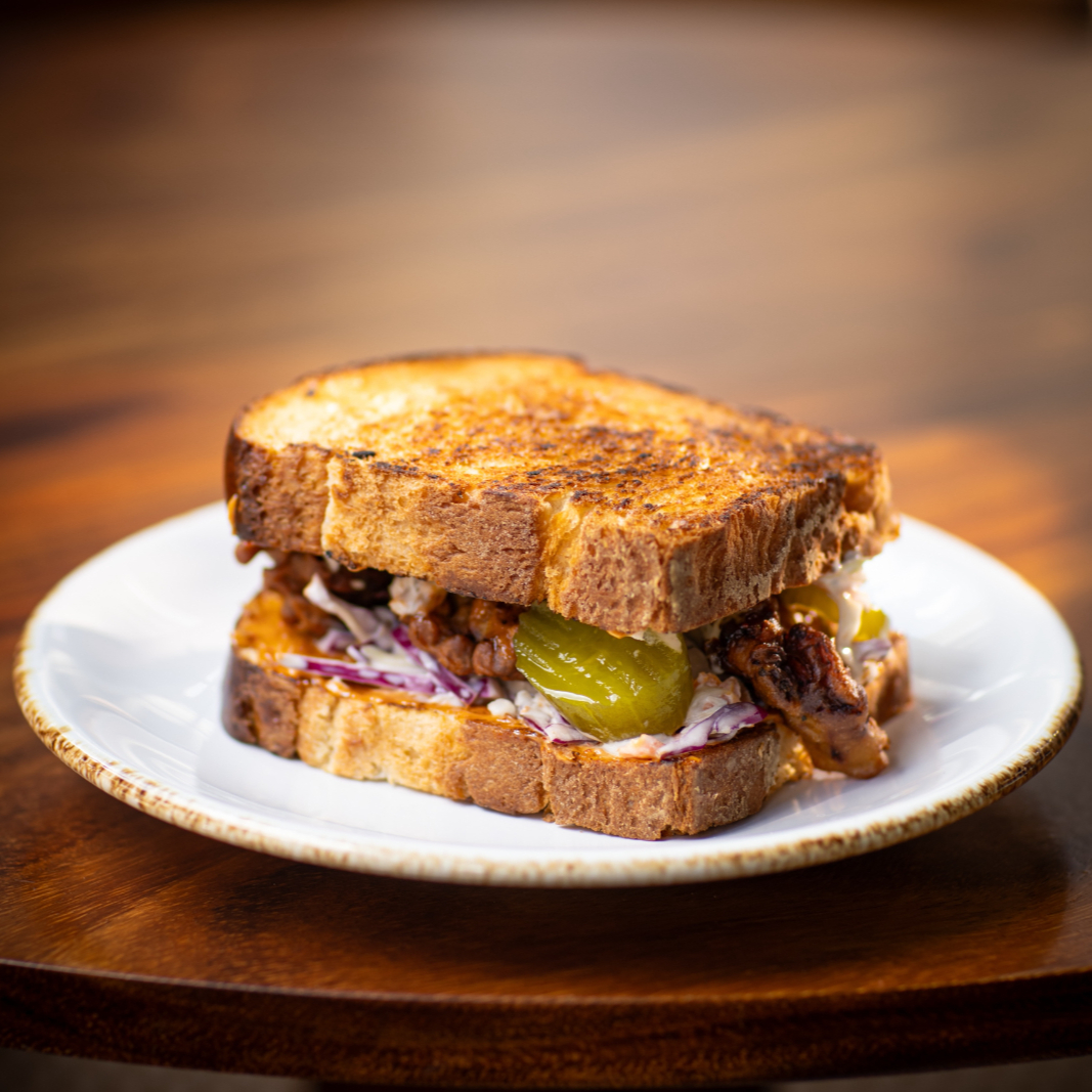Pan brioche, pollo empanizado crunch, aderezo de chipotle, ensalada de col y pepinillos, acompañado con chips de camote