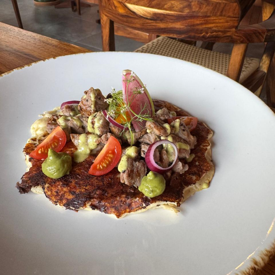 Tortilla de maiz con costra de quesillo, arrachera, rábano sandia, puntos de aguacamole y cebolla