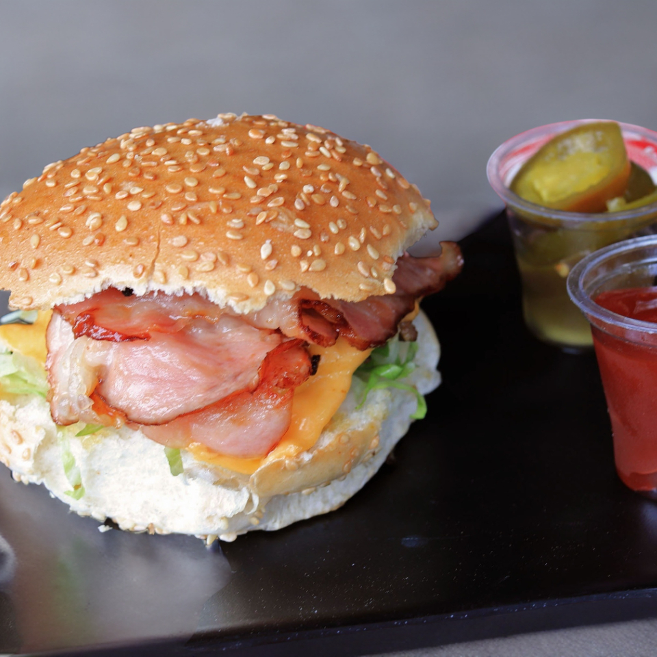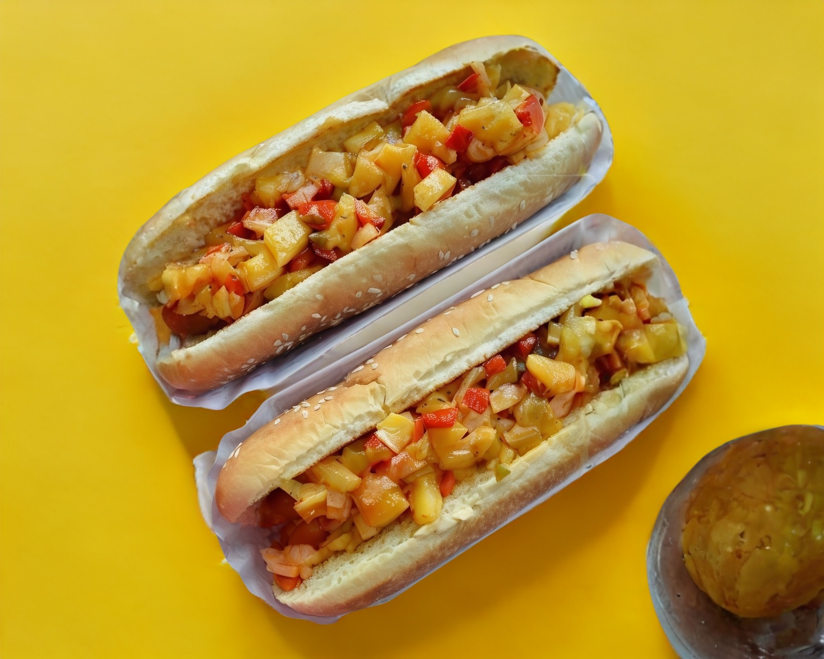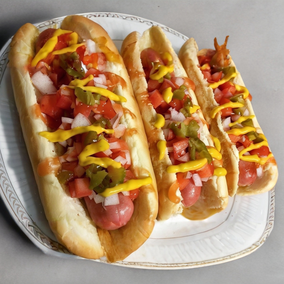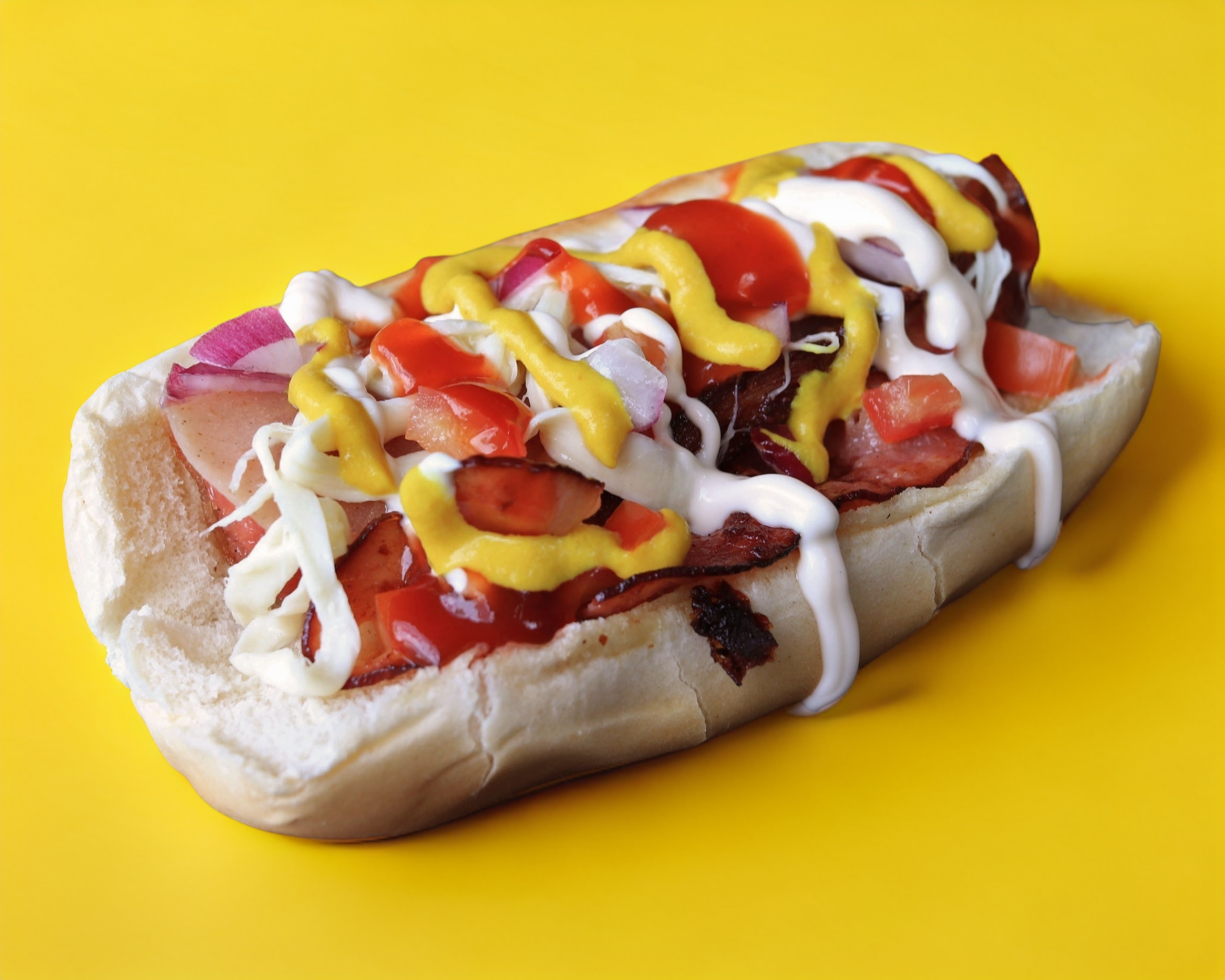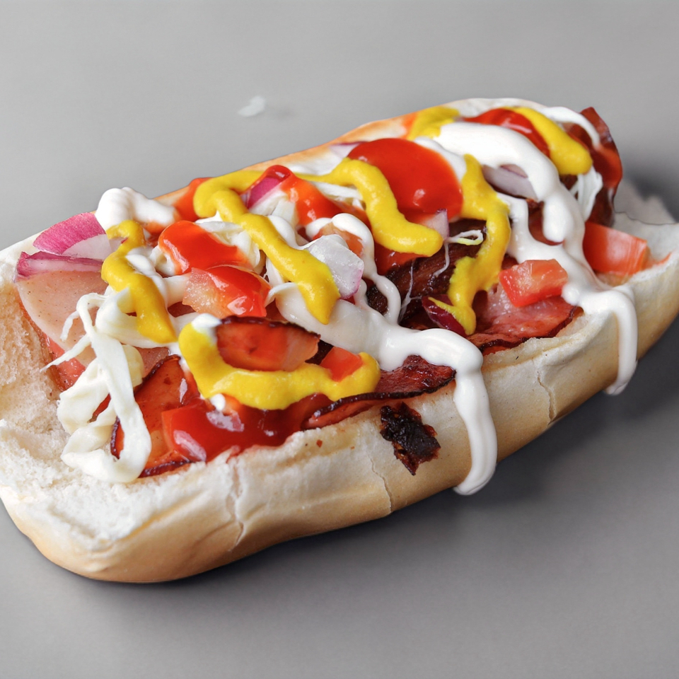 Salchicha, tocino, queso amarillo, cebollas marinadas en salsa BBQ.