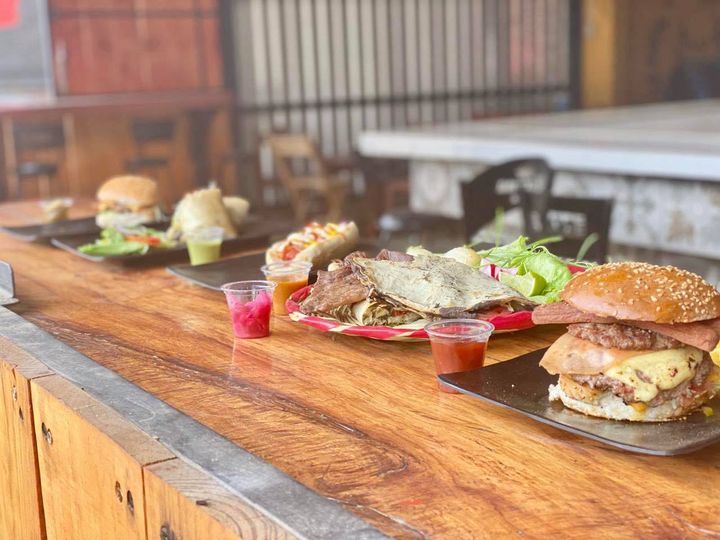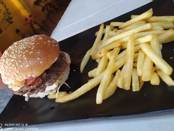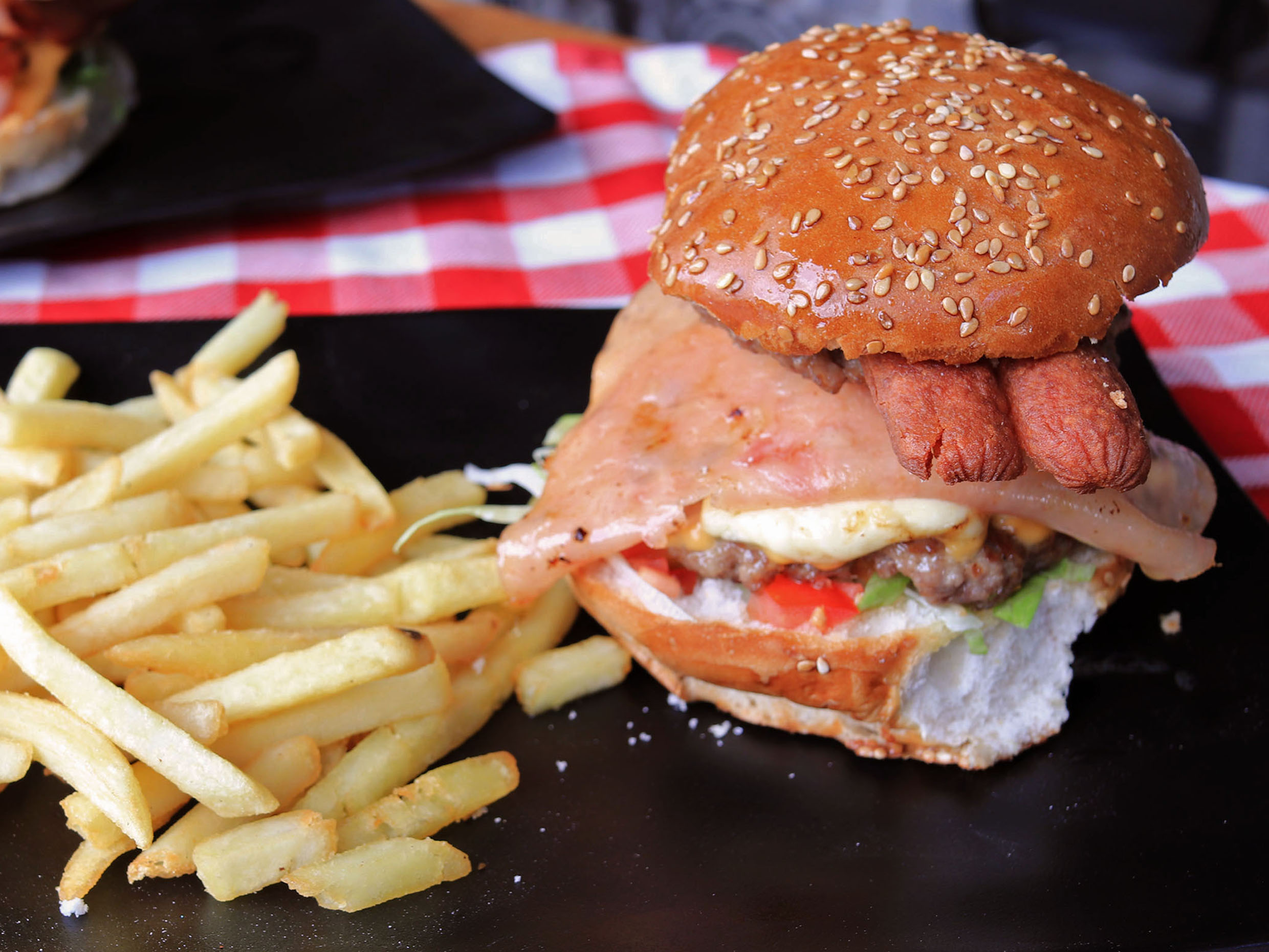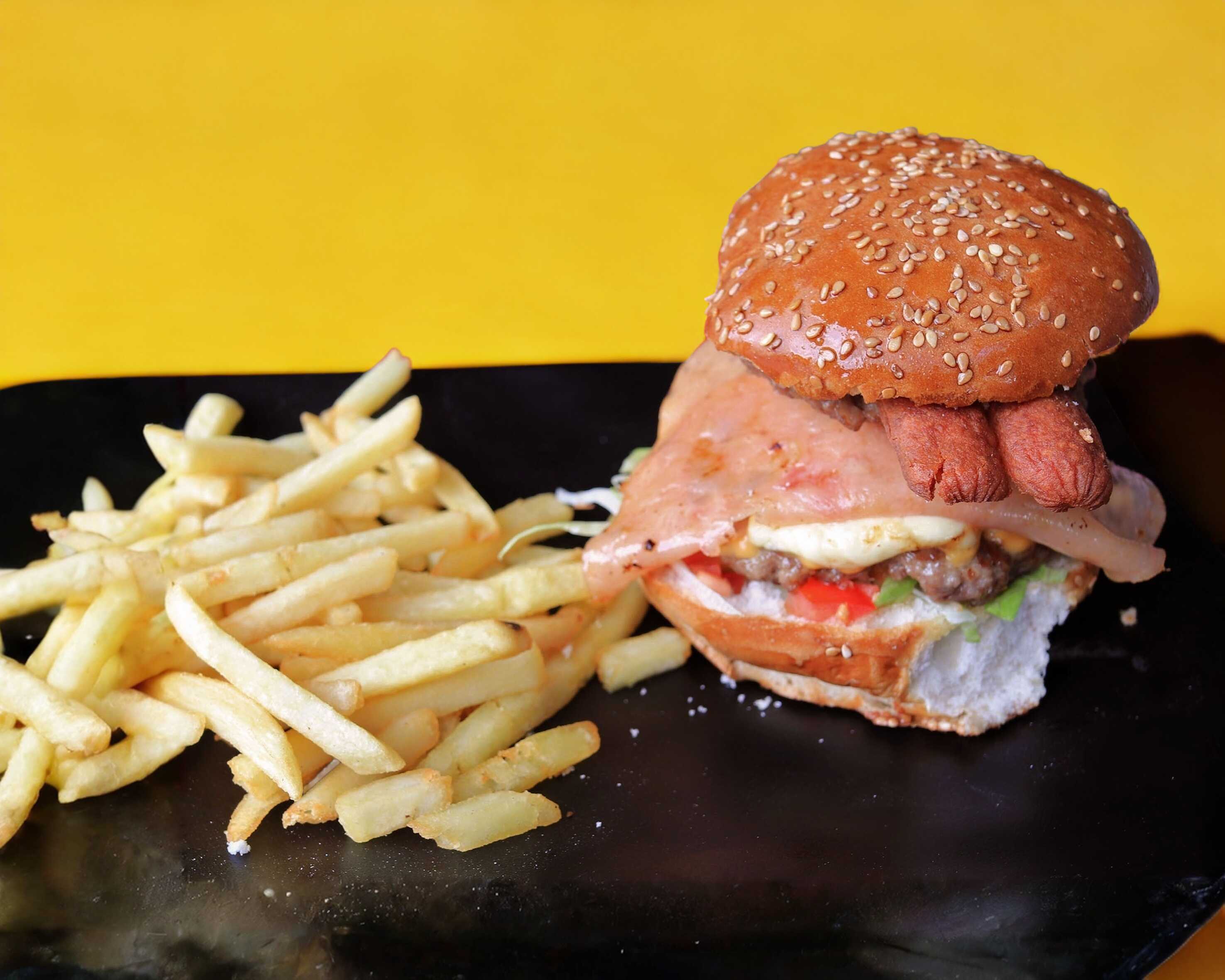 Salchicha, tocino, quesillo, cebolla frita, 2 carnes 100% de res artesanal (100gr), pan grande artesanal, incluye papas (200gr).