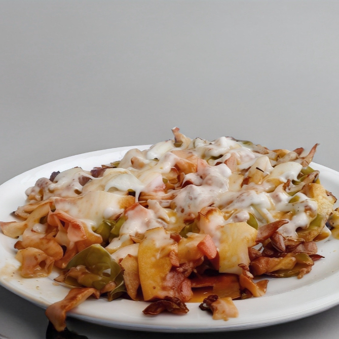 Salchicha, pimientos salteados con cebolla, queso amarillo, quesillo y tocino.