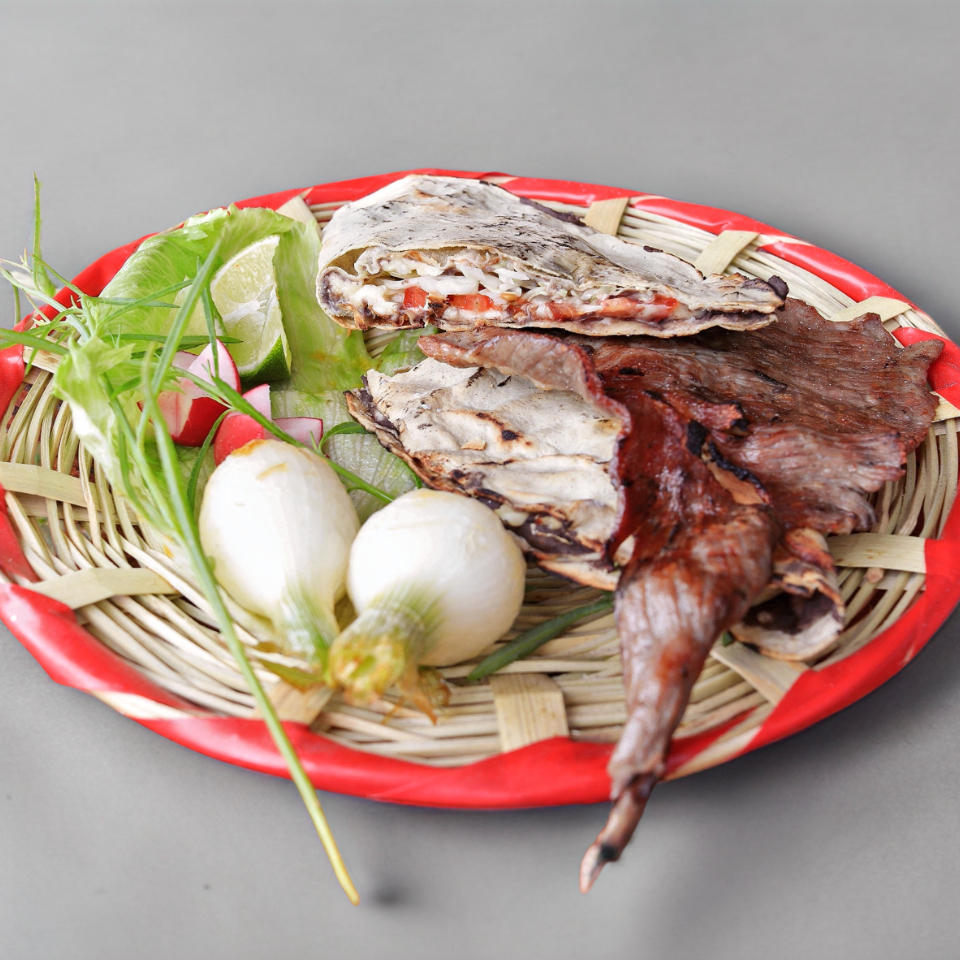 Carne tasajo de primera, pimiento, cebolla, tocino, quesillo, 5 tortillas salsa y guacamole.