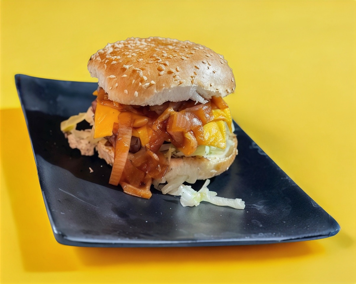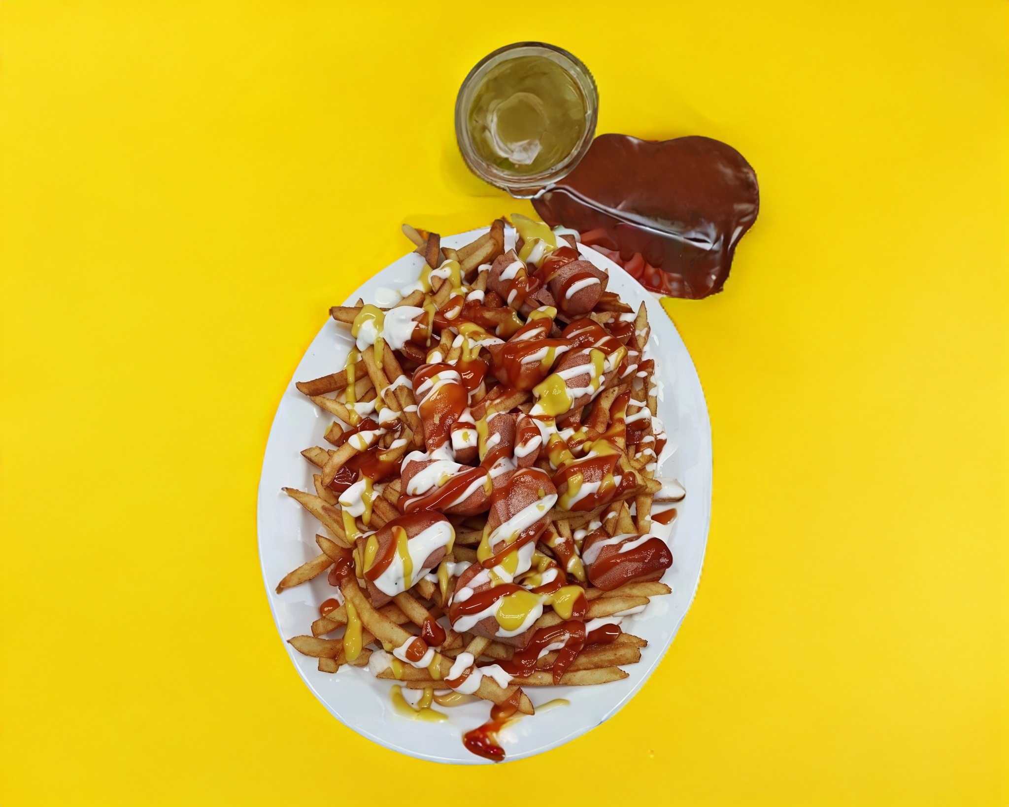 Salchicha, manchego, queso amarillo, cebollas marinadas en salsa BBQ.
