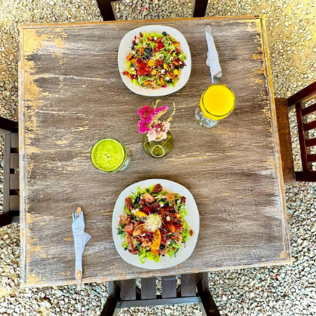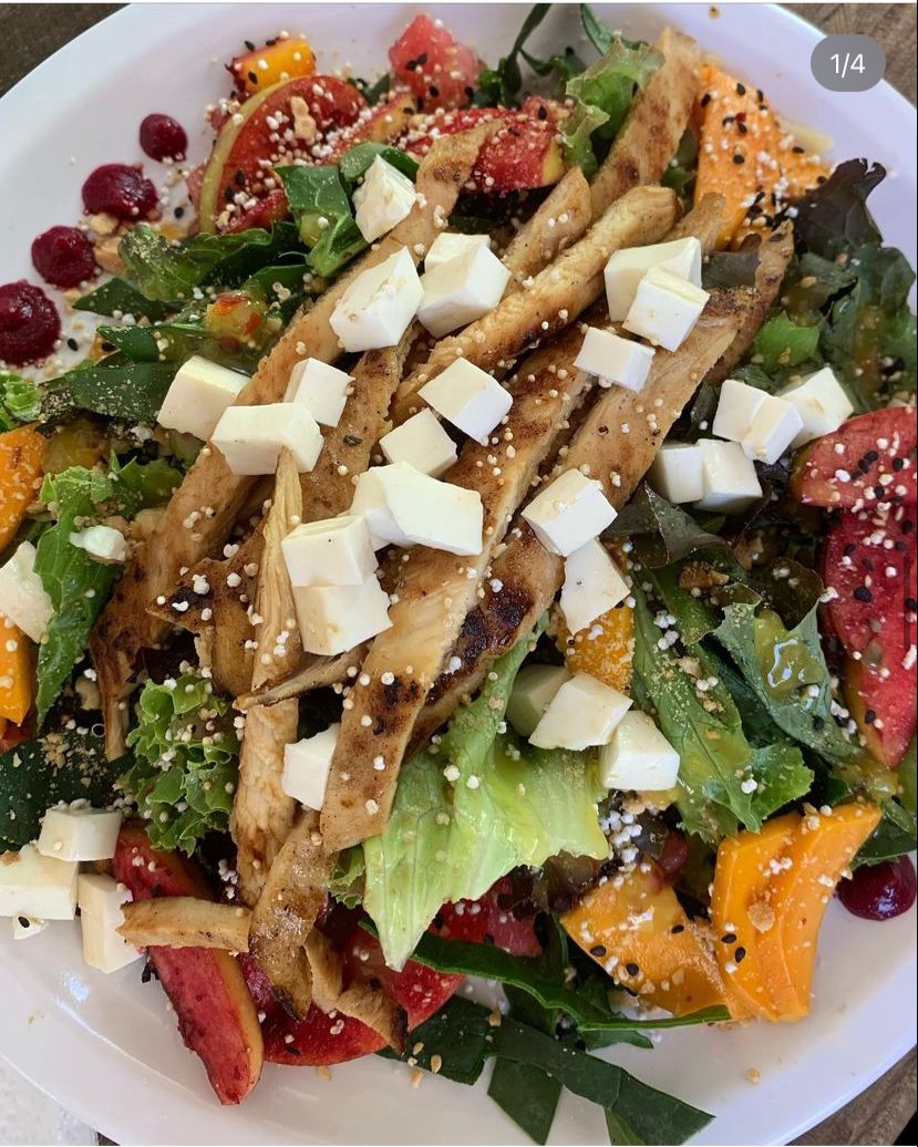 Mix de lechuga, Espinaca, Manzana, Cacahuate, Fruta de temporada, Ajonjoli y Aderezo de la casa