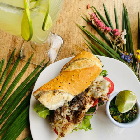 Pan artesanal, Queso panela, Pollo, Verduras salteadas, Aderezo de chipotle, Lechuga, Tomate con ensalada