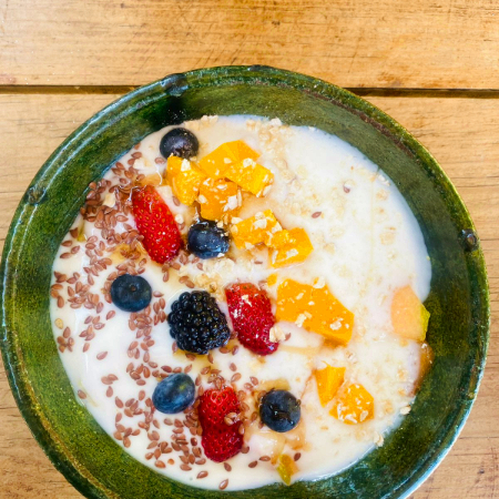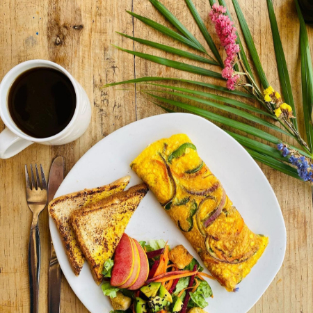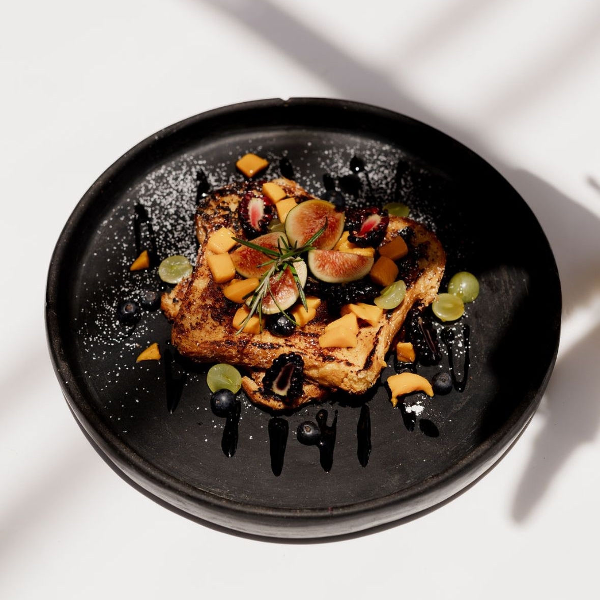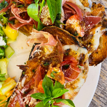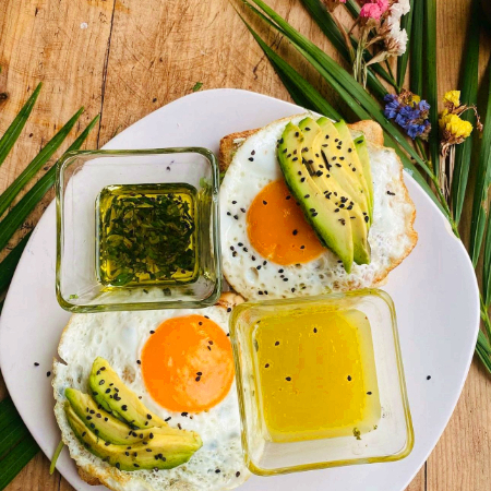 pan de masa madre, queso de cabra, aguacate, huevo tierno, arugula, germinado, ajonjoli negro, aceite de oliva