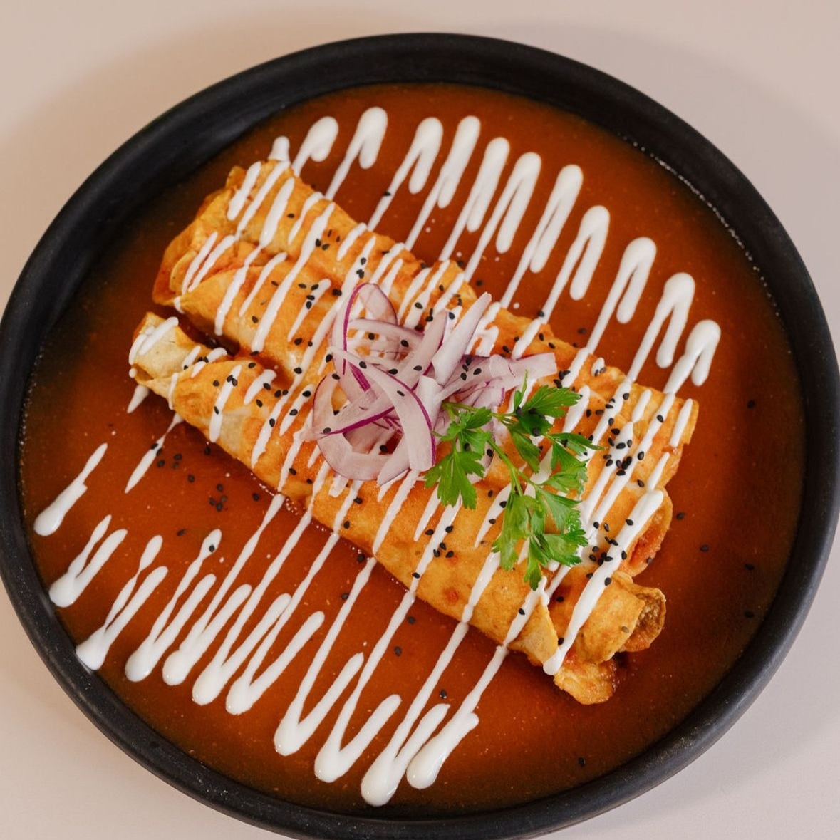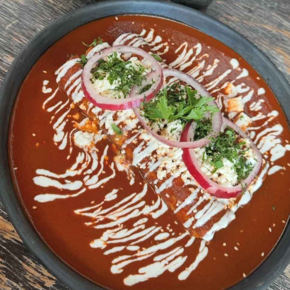(Incluye cafe de olla y fruta del dia) Tortilla de maiz rellena de pollo, bañadas en mole coloradito, acompañado de cebolla morada, perejil, queso fresco y crema