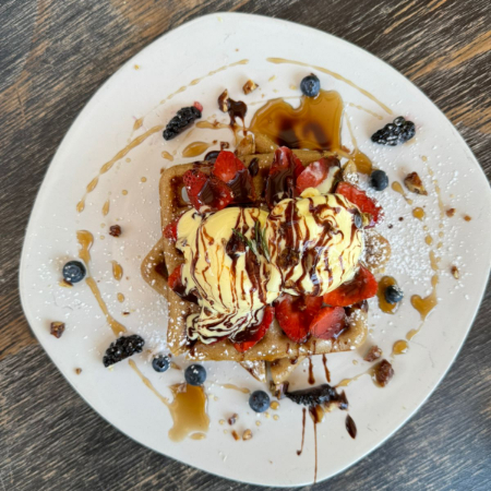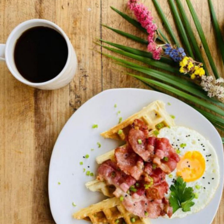 waffles acompañados de huevo termino medio, tocino, perejil, miel de maple y papas a la francesa