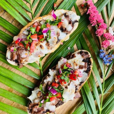 pan artesanal, aderezo de chipotle, frijol, arrachera, queso gouda, tomate, cebolla morada, lechuga, arugula y germinado con papas a la francesa