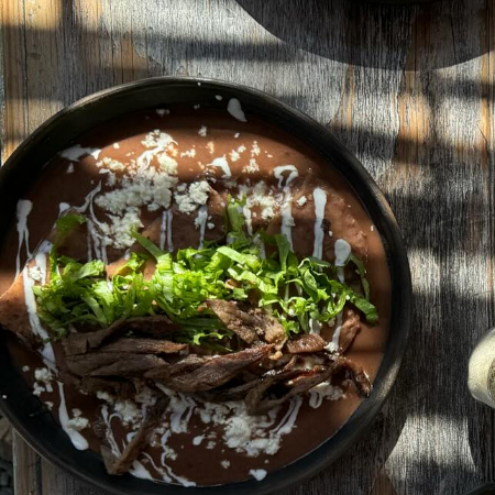 3pz de tortilla frita bañada en salsa de frijol, acompañado con queso fresco, crema, cebolla morada y perejil