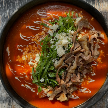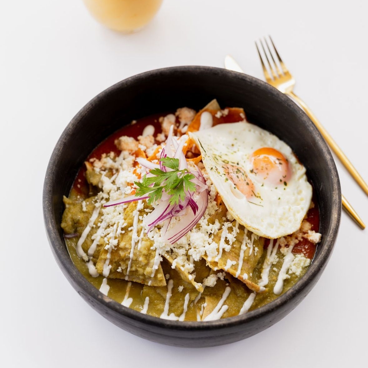 Tortilla frita, bañada en la salsa divorciada, acompañados con queso, crema, cebolla morada y perejil t