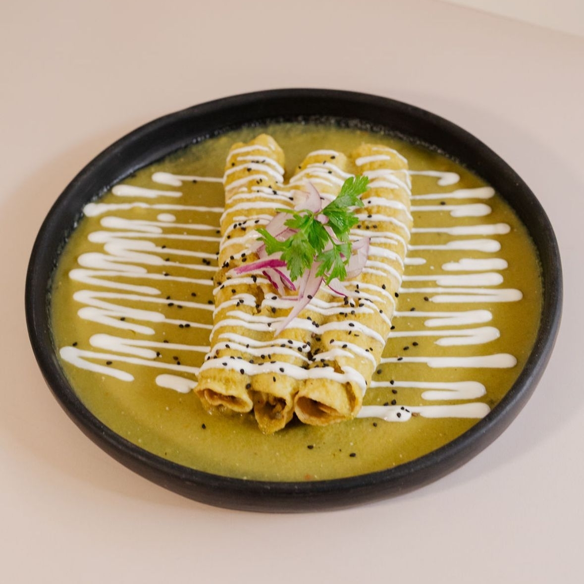 Orden de 3 Tortilla de maiz rellena de pollo, bañada en salsa verde cremosa y acompañada de queso fresco, lechuga y crema