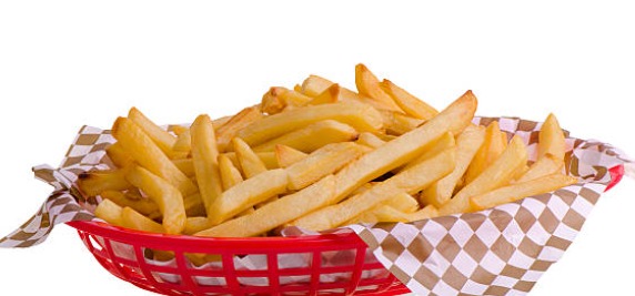Porción generosa de papas fritas en canasta.