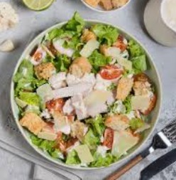 Ensalada fresca con lechuga, aderezo césar y crutones.