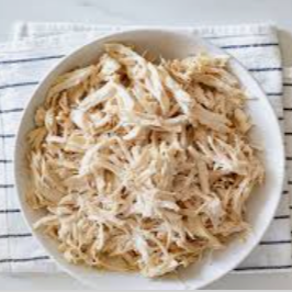 Pechuga de pollo deshebrada y sazonada.