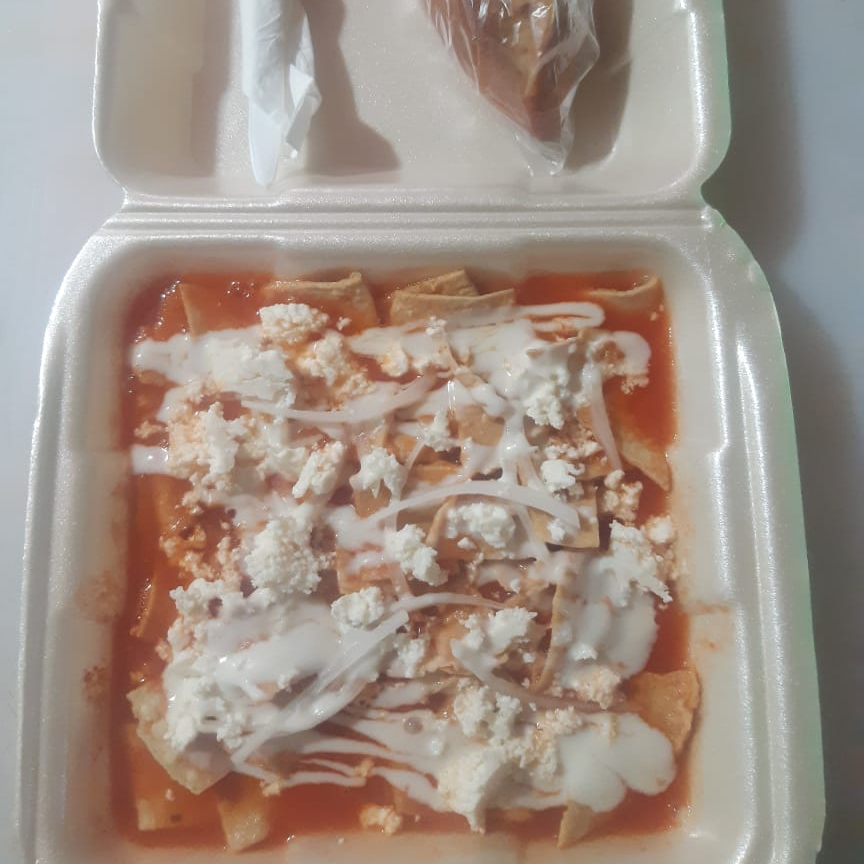 Salsa roja de la casa servida con tortilla frita, queso, crema, acompañado de café y un huevo al comal.