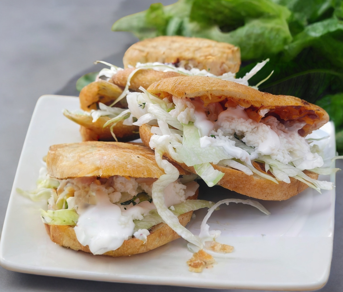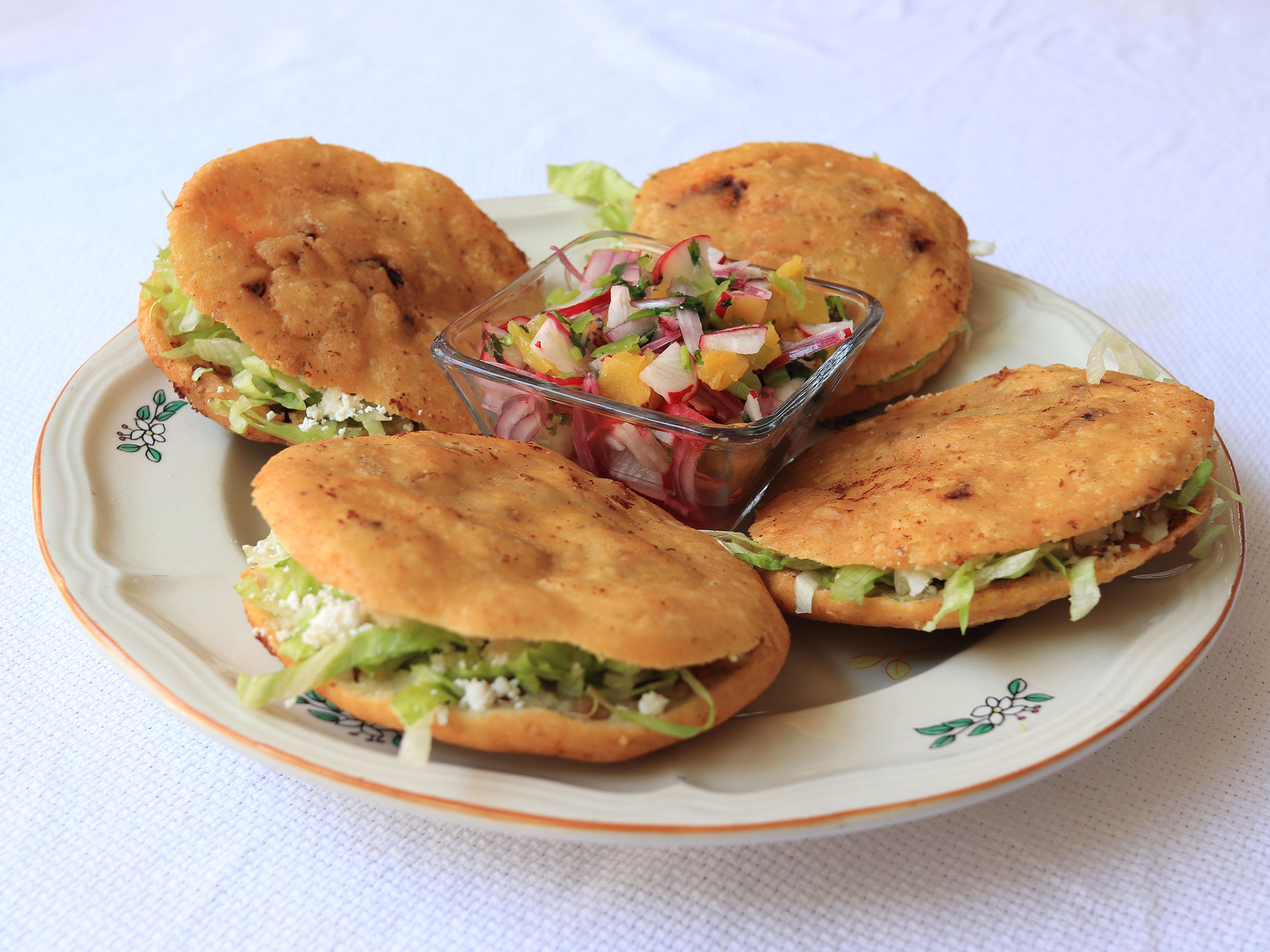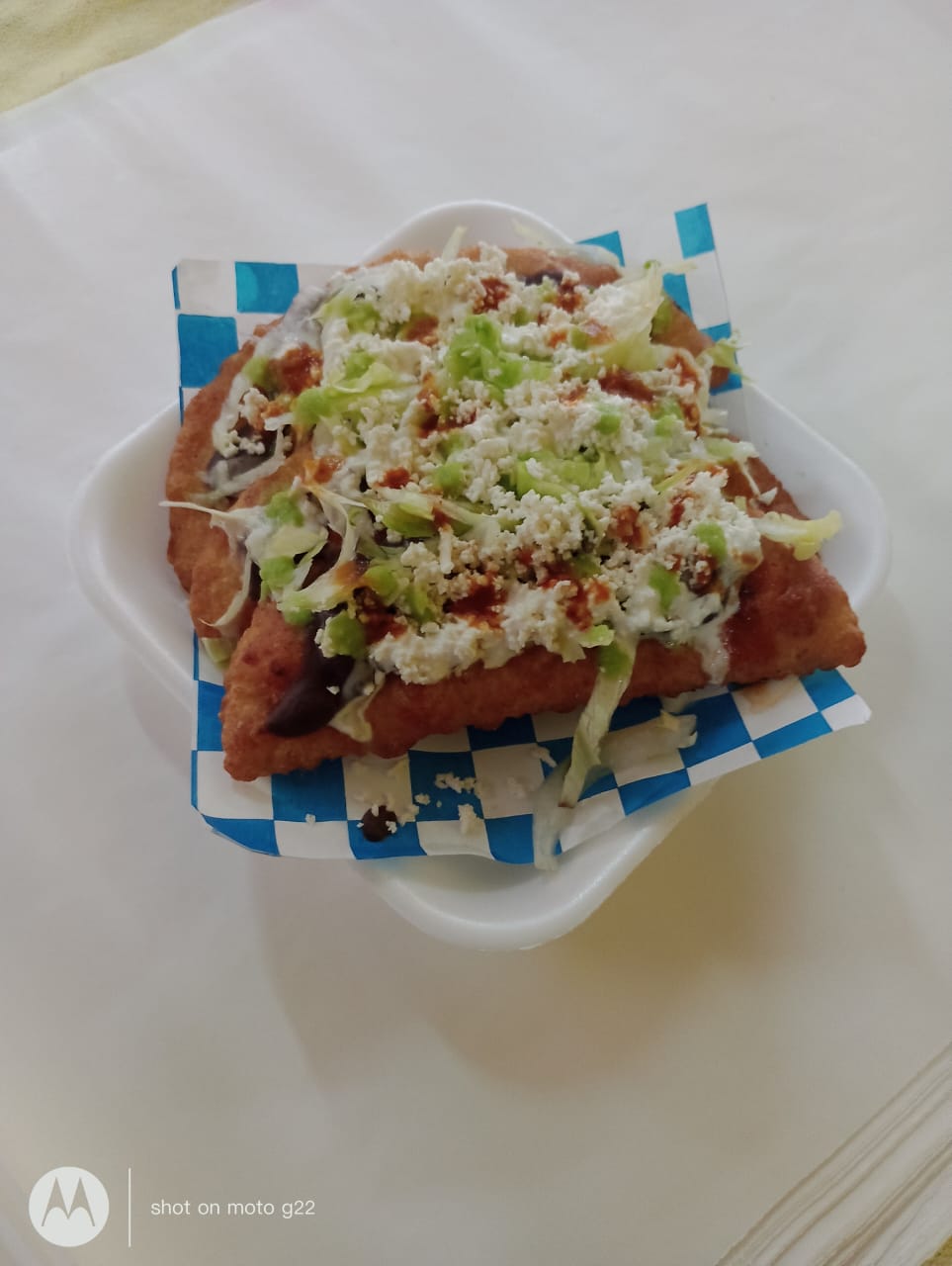 Deliciosa gordita de masa de maíz frita, rellena con un exquisito guisado, acompañada con lechuga, queso y crema, acompañada de una deliciosa salsa casera.