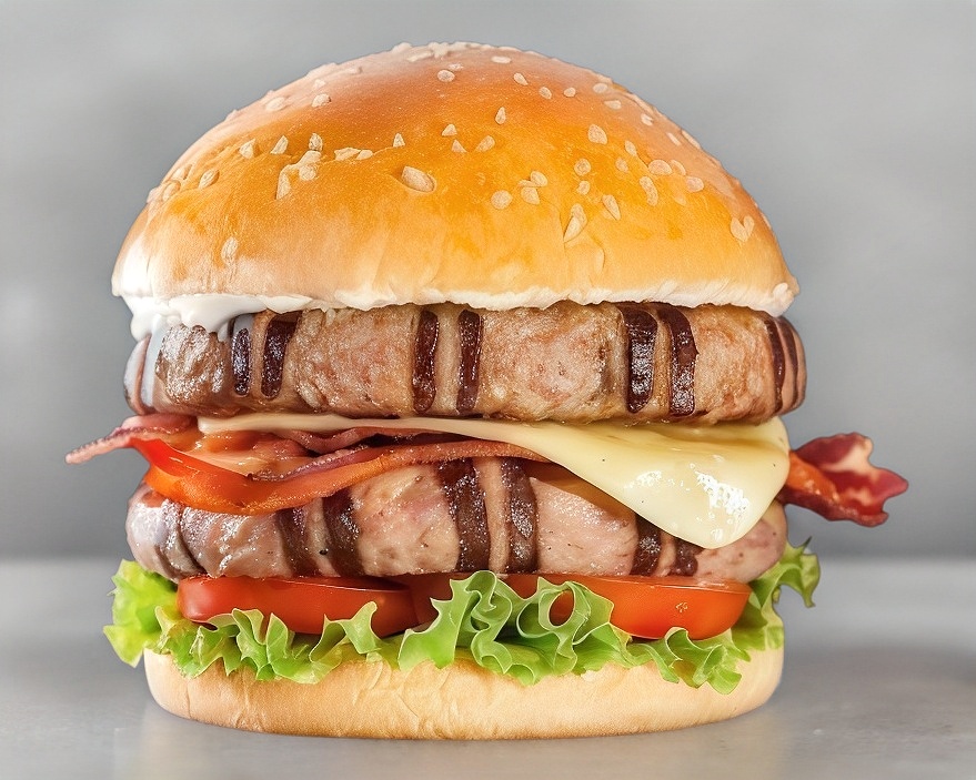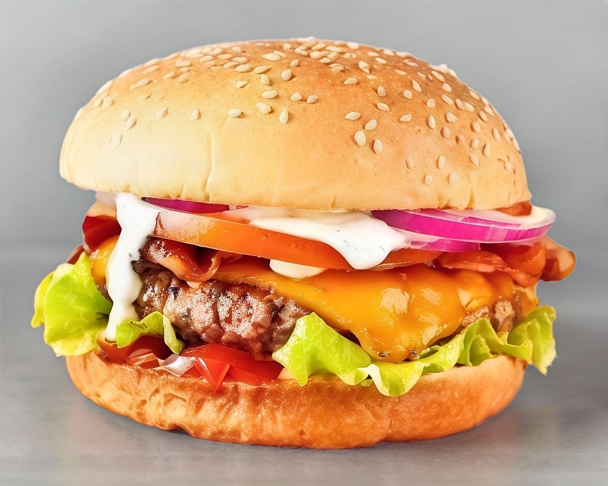 Pizza Burger (carne, jamón, queso amarillo, queso manchego, pepperoni, salsa de tomate, cebolla, tomate, chile, lechuga y aderezos).
