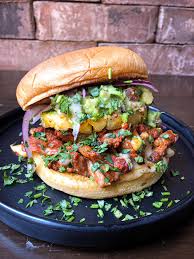 Hamburguesa al pastor (carne, jamón queso amarillo, quesillo, queso manchego carne al pastor, cebolla, tomate, chile, lechuga y aderezos).