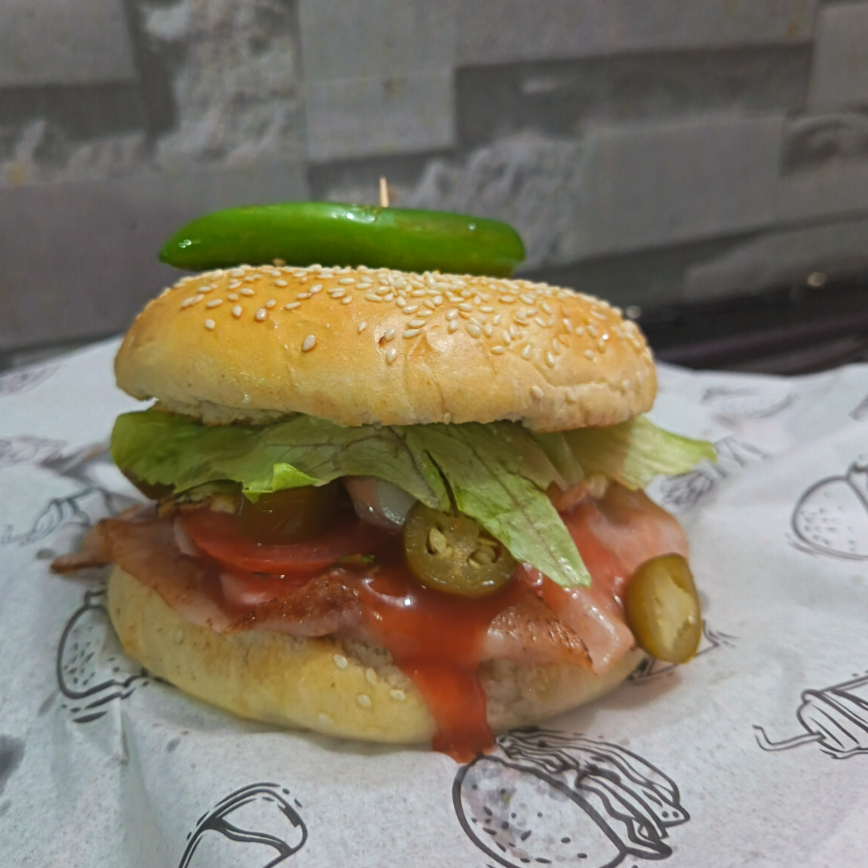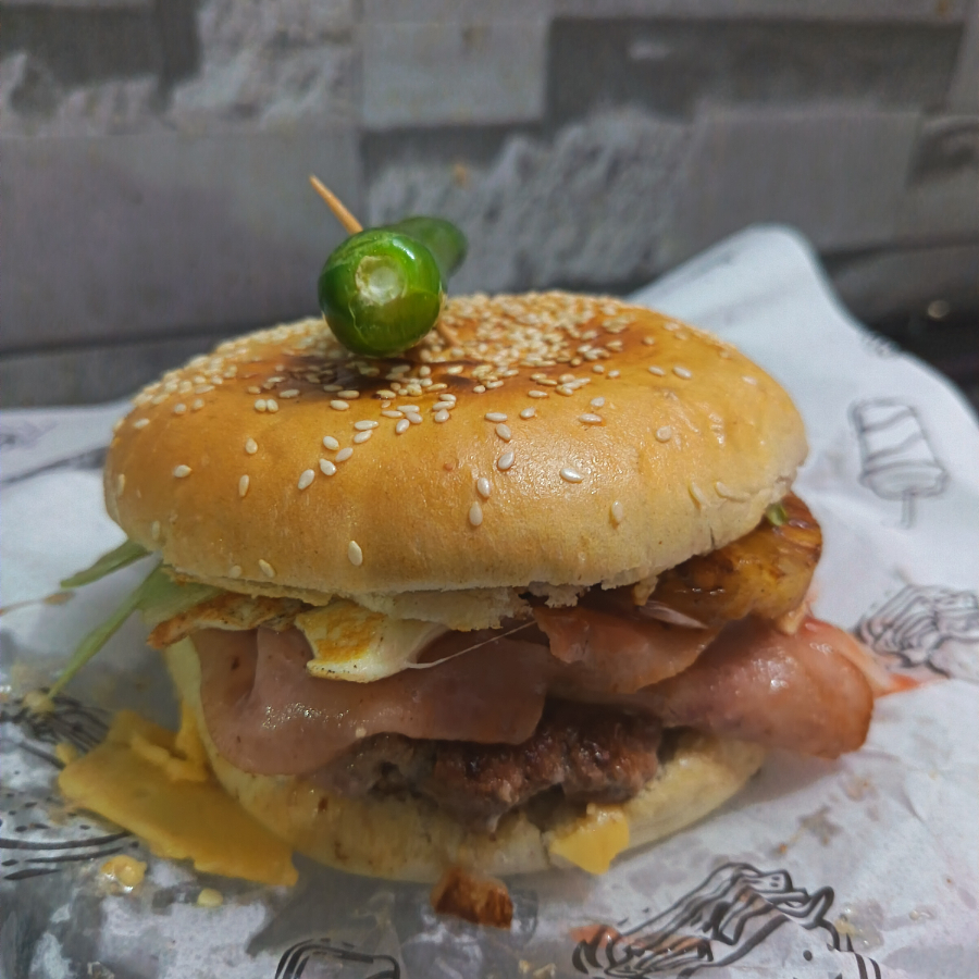DOBLE CARNE DE LA CASA ACOMPAÑADA DE QUESILLO, TOCINO, ADEREZOS, JITOMATE, CEBOLLA, LECHUGA JAMON Y QUESO AMERICANO